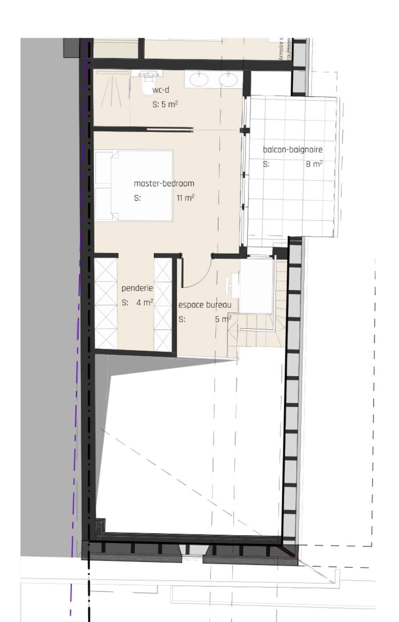 . Auf der 2ᵉ Ebene befindet sich eine wunderschöne Mastersuite mit einem zum Wohnzimmer hin offenen Bürobereich, einem großen, mit vier Schränken ausgestatteten Ankleidezimmer sowie einem Duschbad mit WC und Doppelwaschbecken. Die Mastersuite verfügt außerdem über einen direkten Zugang zum zweiten Balkon.