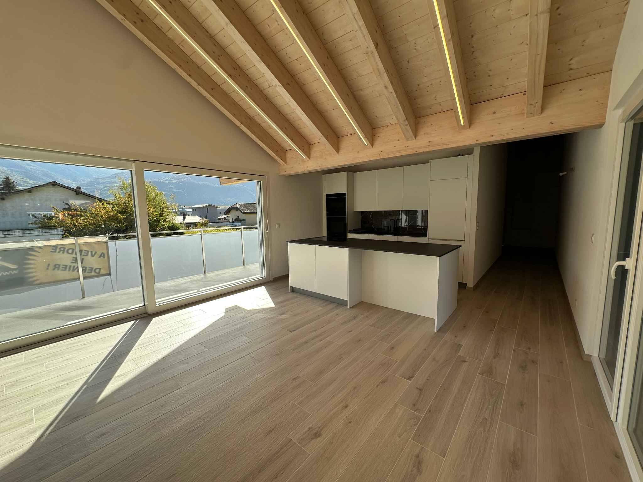 Magnifique attique de 124m2 avec charpente apparente, une grande terrasse de 75 m2 et bureau ou surface commerciale de 48m2, dans une nouvelle construction contemporaine, idéalement situé à Plan-Conthey.