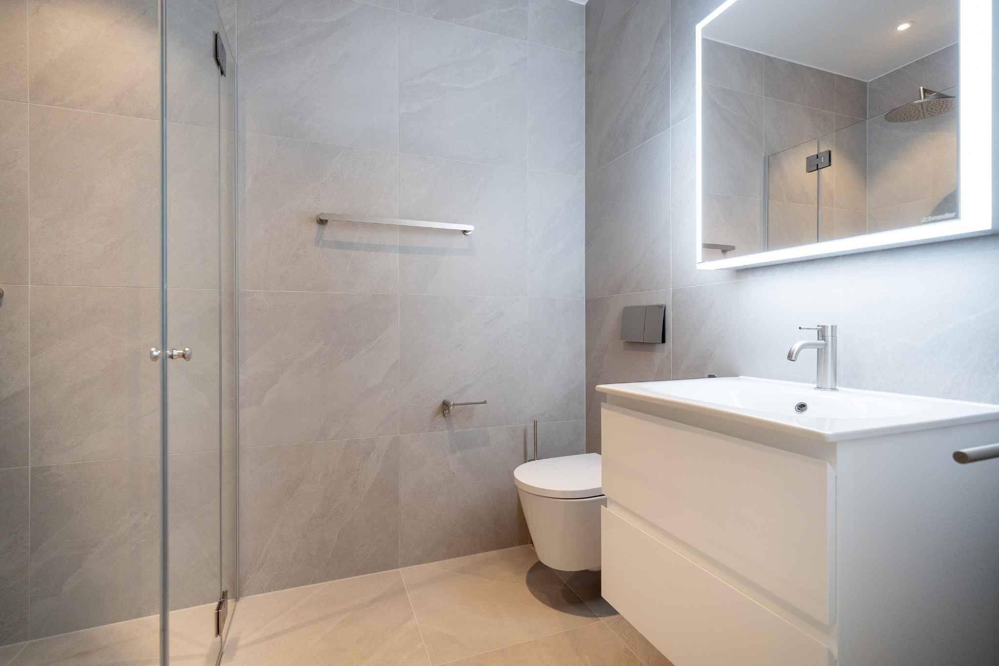 La salle de douche contemporaine comprend une douche à l’italienne, un toilette et une arrivée d’eau prévue pour le lave-linge.