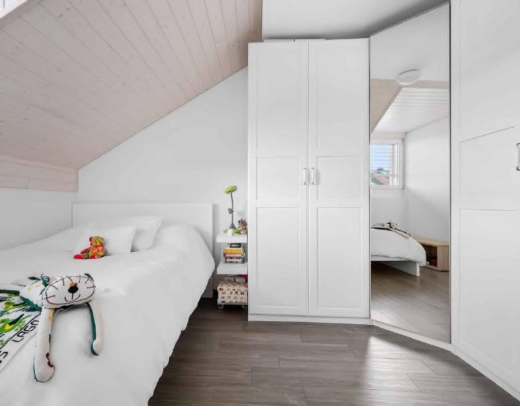 De plus, un bel escalier nous accompagne dans une grande mezzanine actuellement agencée en salon mais qui pourrait également faire office de troisième chambre.