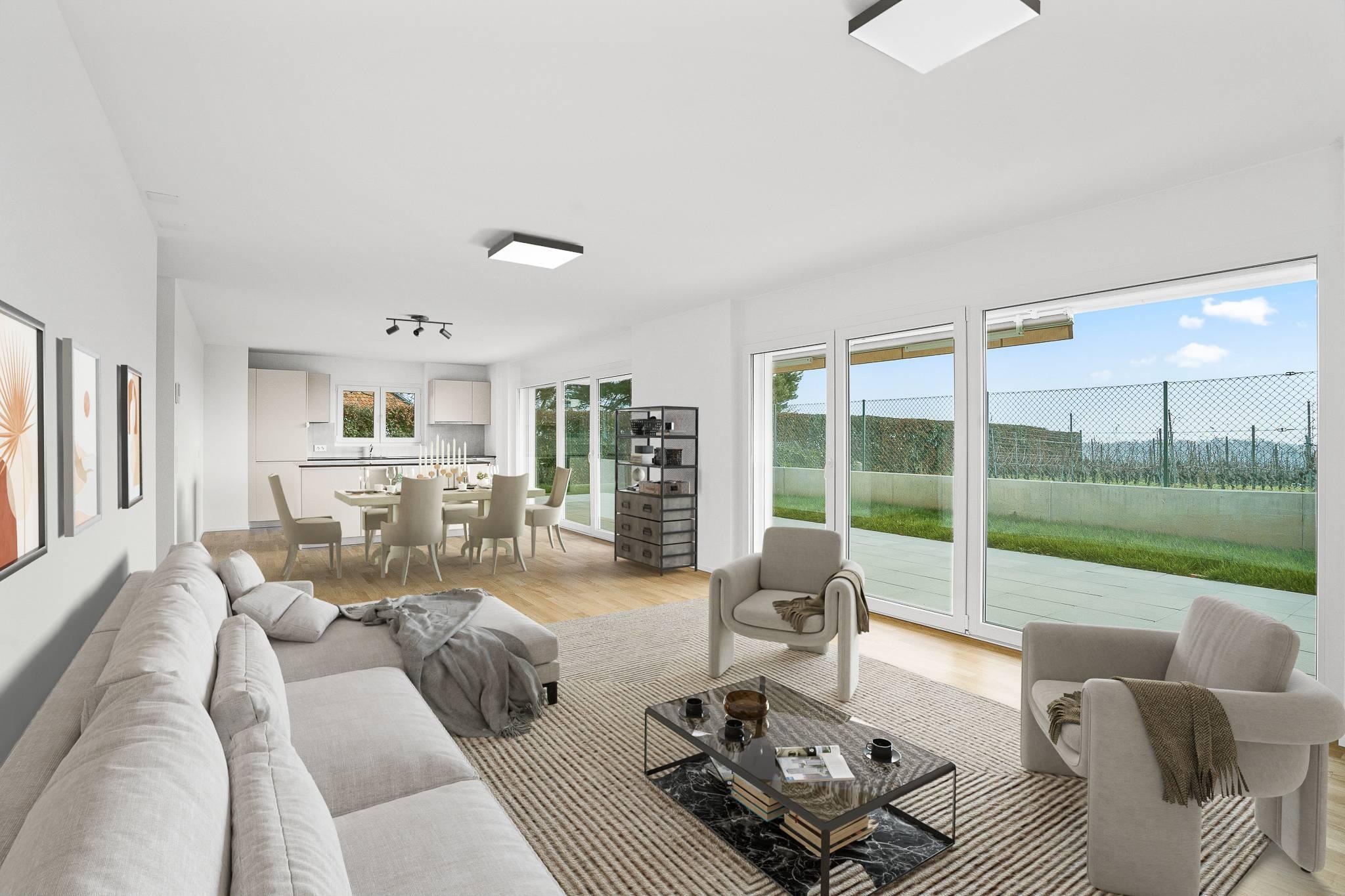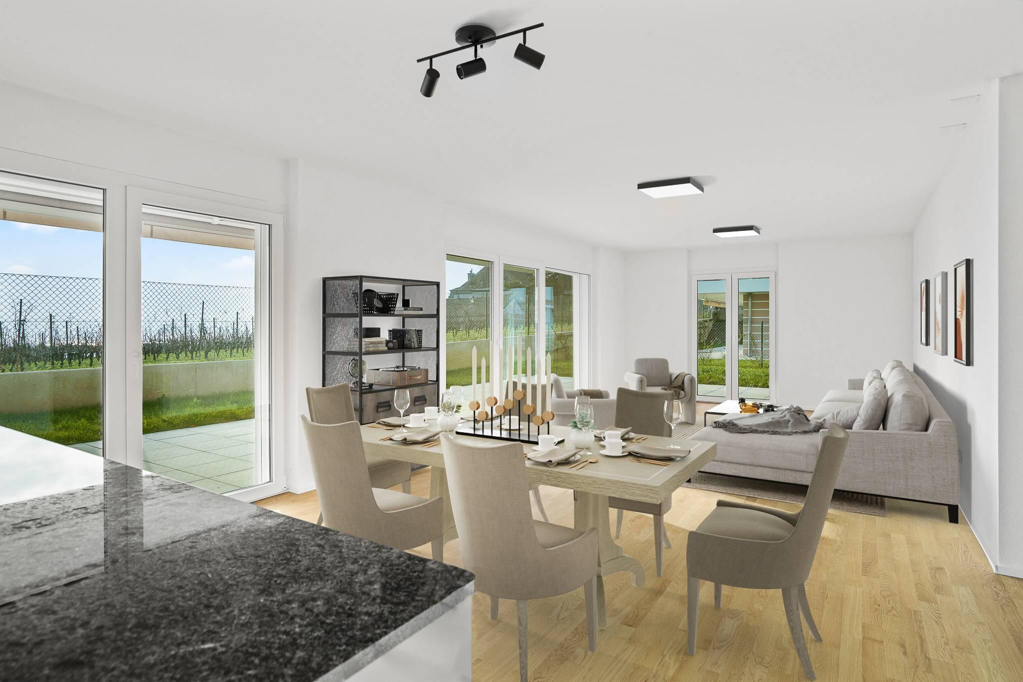 Dans un cadre exceptionnel offrant une vue dégagée sur les vignes, les Alpes et le lac, ce bel appartement neuf est distribué sur une surface de 146 m2 pondérés.