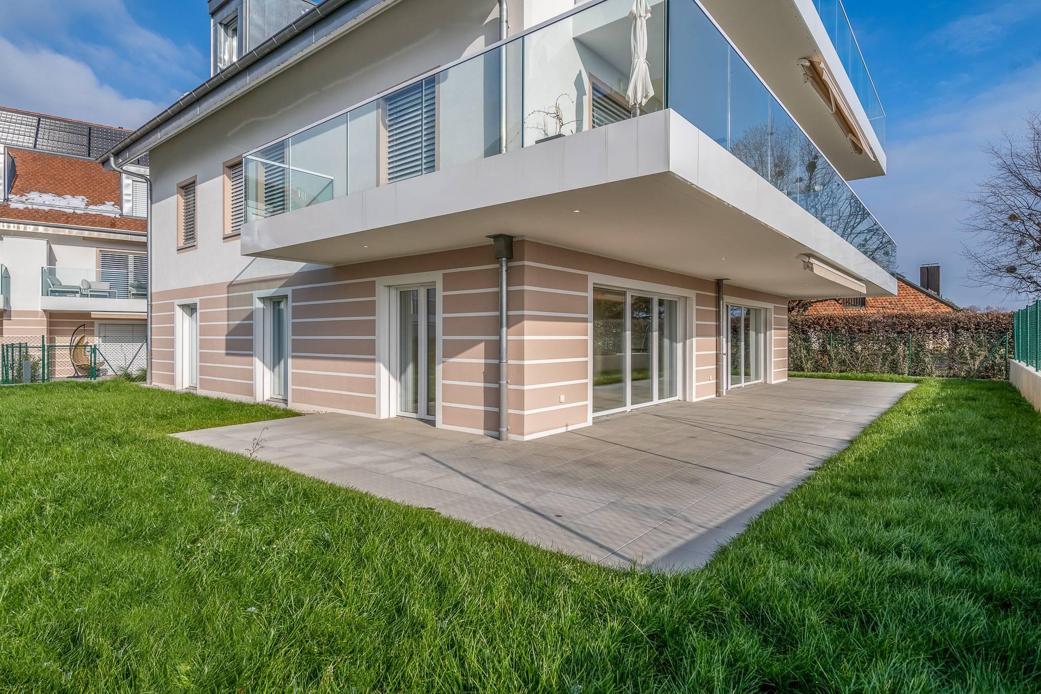 Celui-ci est composé de 4.5 pièces, au rez-de-chaussée, avec spacieuse terrasse et jardin entièrement clôturé. L'appartement bénéficie d'un accès direct avec ascenseur. Il compte 3 chambres à coucher et 2 salles d'eau.