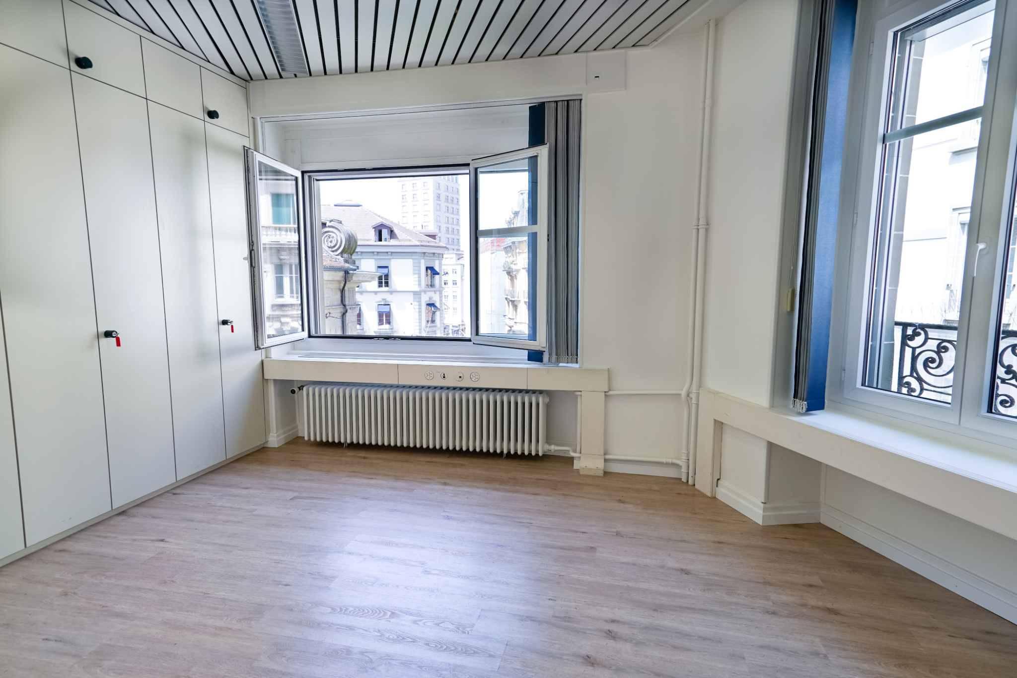 Donnant directement sur la place Saint-Laurent, cette surface se distribue en 5 espaces avec vue sur les toits et une belle luminosité.