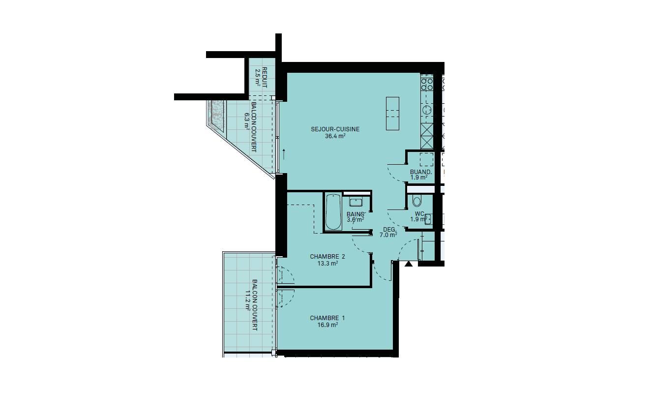 Un hall d'entrée avec armoires murales, un séjour / cuisine ouverte de de plus de 36m2 avec accès à un premier balcon couvert, une salle de bains, un WC séparé, deux chambre à coucher avec accès à un deuxième balcon couvert, une buanderie avec arrivées d'eau pour la colonne de lavage. Une cave complète ce bien.