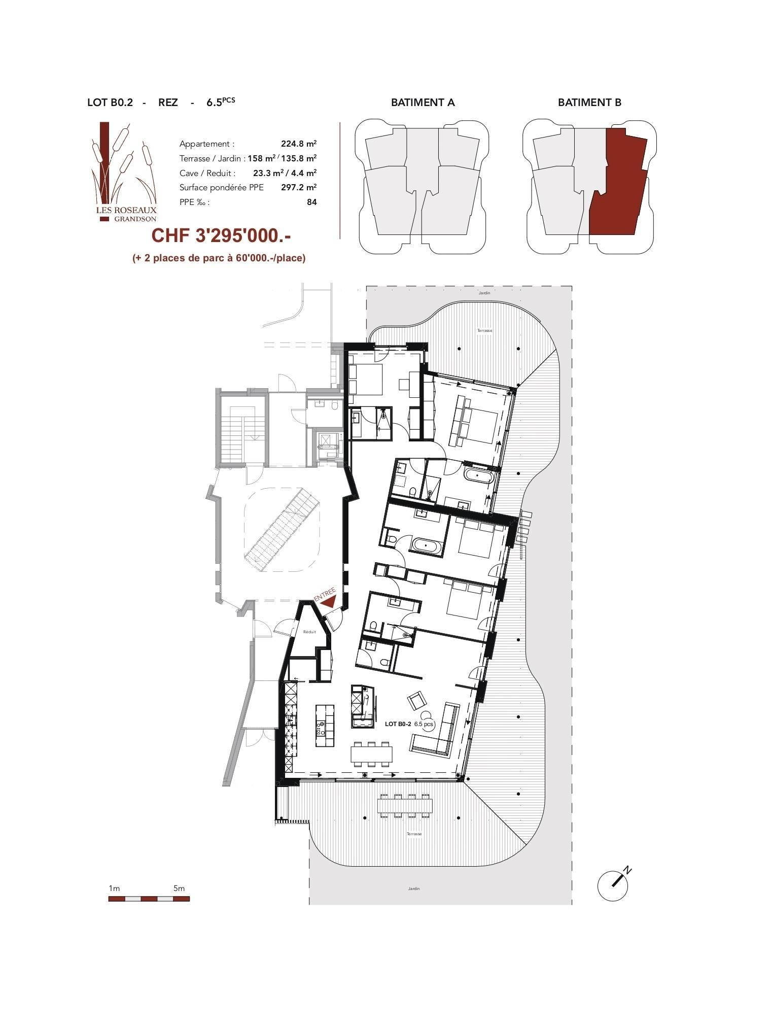Une cave de 23m2, une terrasse de 158m2, un jardin de 135m2 ainsi que 2 place de parcs (CHF 60'000.- l'unité) en sus complètent ce bien.