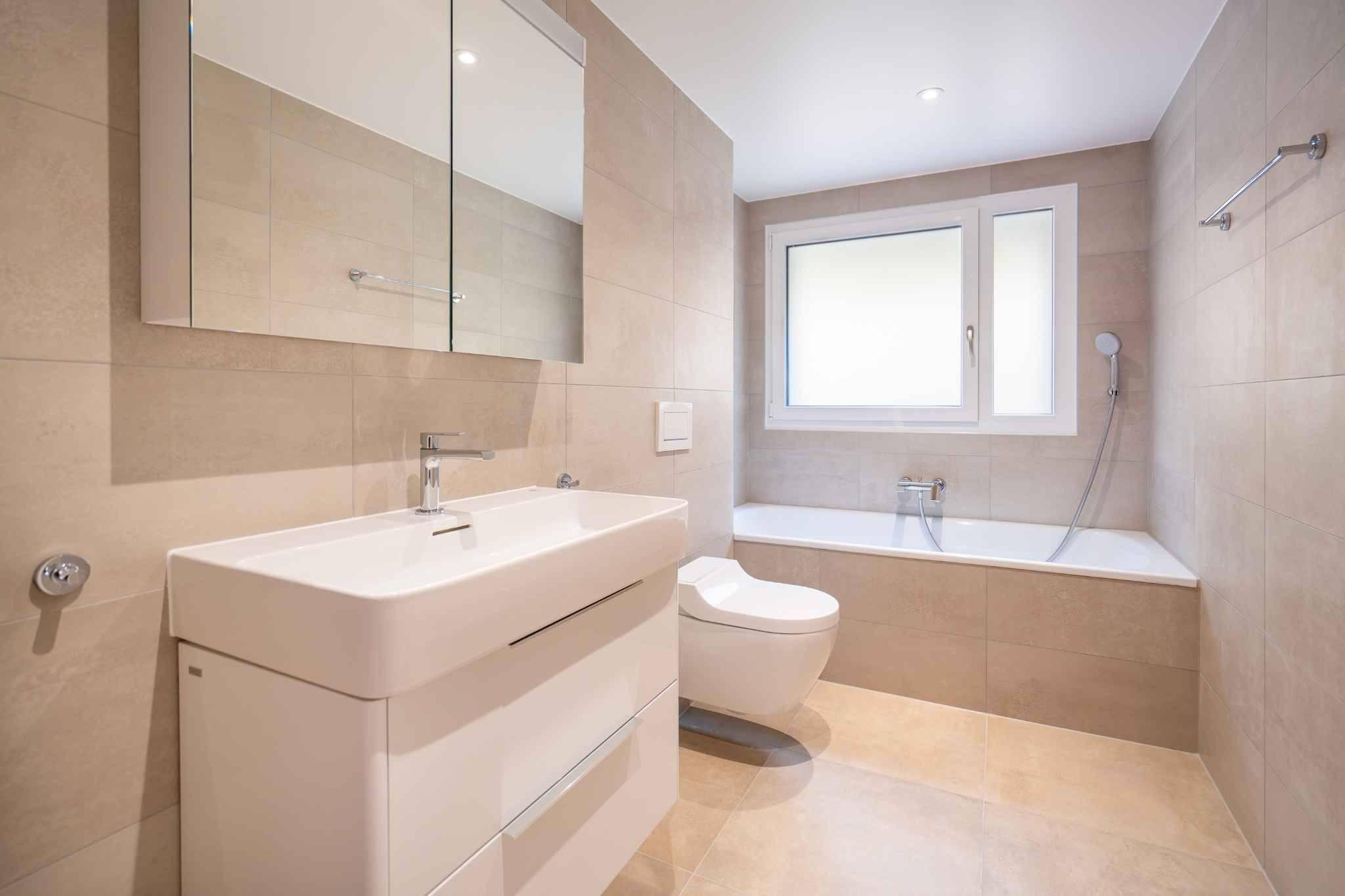 The 5.5-room duplex: This duplex, directly accessible by a private elevator, comprises a large, bright living room opening onto the garden with a magnificent view of the lake and mountains. A bedroom/study, a cinema room, a bathroom and a laundry area complete this level.