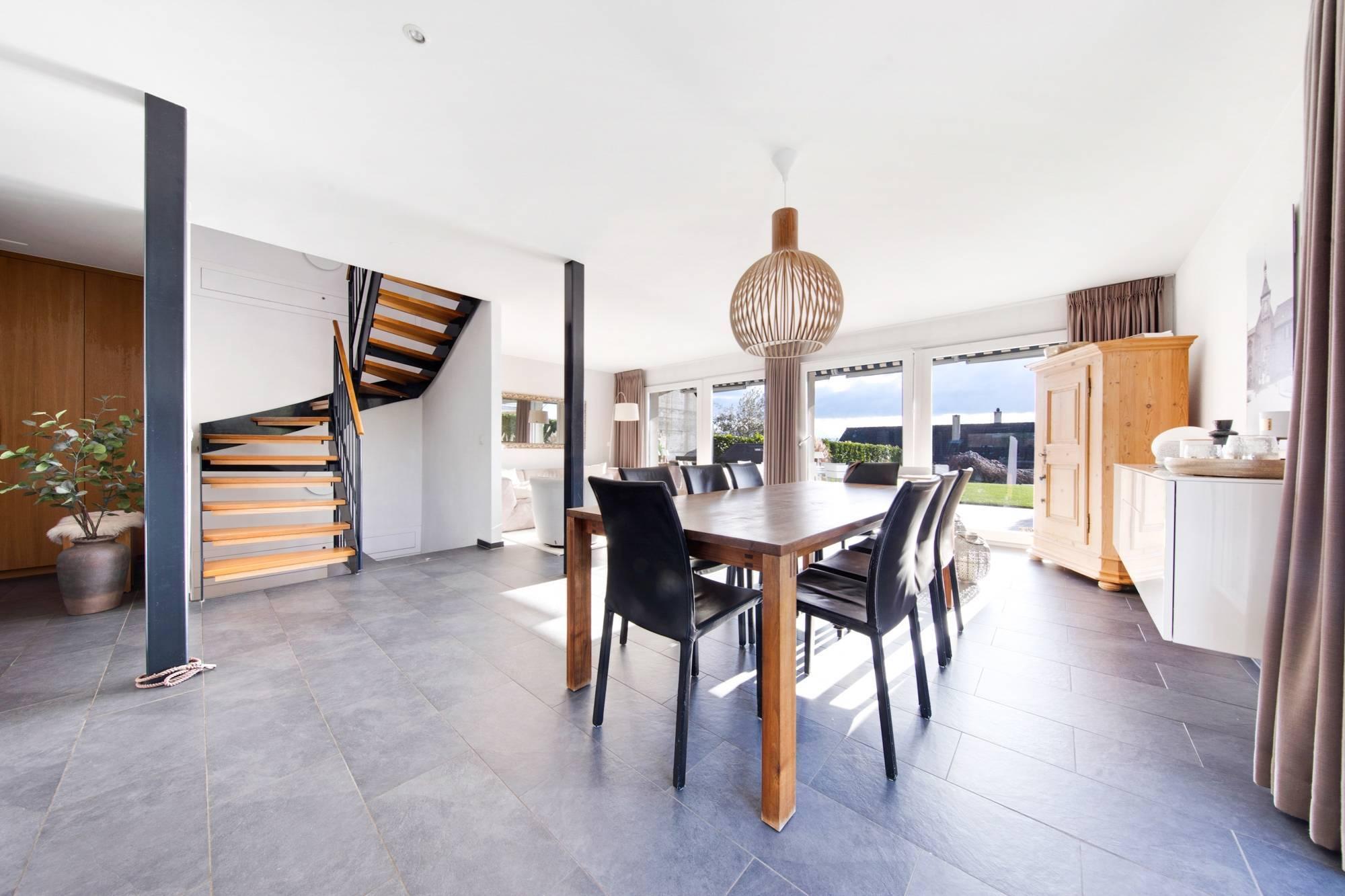 - Hall d’entrée avec placard, un WC visiteurs et une cuisine moderne avec ilot centrale ouverte sur un vaste séjour baigné de lumière, avec accès direct à la terrasse et au jardin.