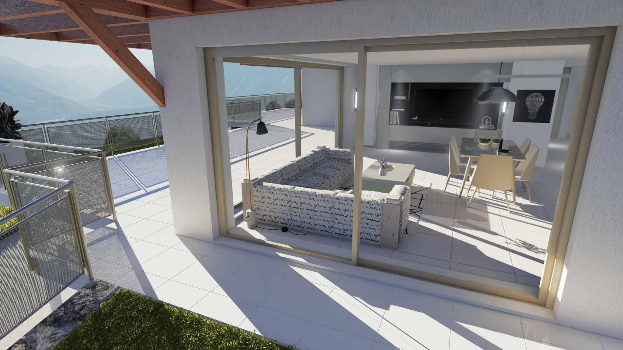 Sa vaste pièce de vie de 53 m2 permet de bénéficier d'espace et de lumière. Surplombant la vallée, à vous la vue imprenable sur les montagnes et le Haut-Valais.