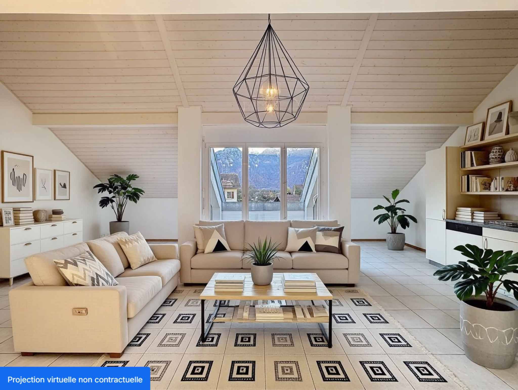 A 5 min. à peine de Villeneuve, dans un quartier calme et résidentiel, à proximité directe du centre du village de Rennaz et de l' Hôpital de la Riviera ainsi que de toutes les commodités et de l'autoroute, dans un petit immeuble de 3 étages construit en 2010 très bien entretenu et bénéficiant d'une excellente enveloppe énergétique, Superbe Appartement de 3.5 pièces, regroupant 94 m2 + une grande mezzanine de 15 m2 et un balcon dans les toits.