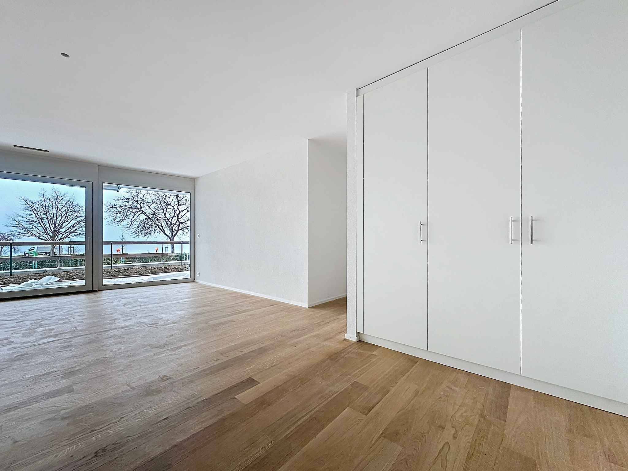 Hall d'entrée, cuisine ouverte sur le séjour de 33m2 avec accès à une première terrasse couverte et à un jardin de 45m2 avec vue sur le lac. Deux chambres à coucher avec chacune accès à une terrasse et à un jardin. Une salle de bains avec raccordement pour la colonne de lavage et un WC visiteur. Les 2 chambres à coucher disposent d'un accès à l'extérieur. Une cave complète ce bien.