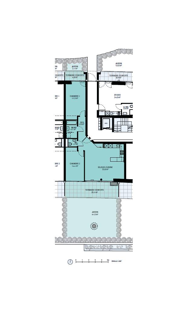 Les appartements du rez-de-chaussée ont un jardin privatif et tous les logements bénéficient de terrasses ou balcons. 11 attiques avec vue panoramique et des rooftop terrasses offrent jusqu’à 249m2 de surface pondérée.