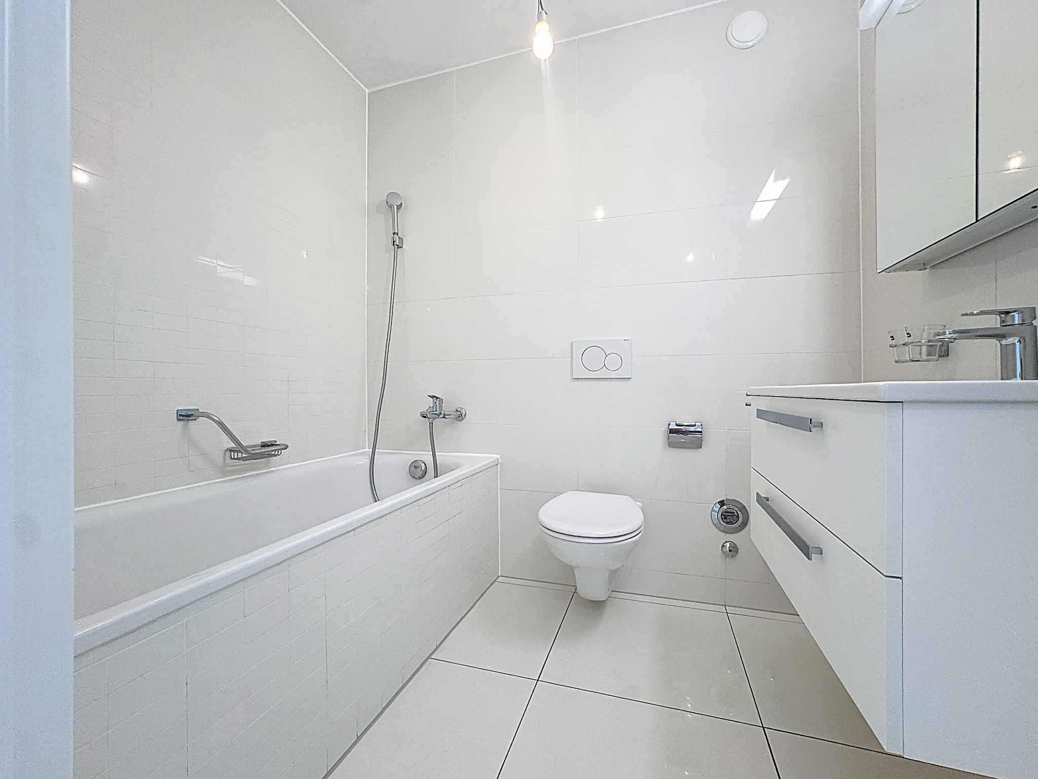 Il se compose d'un hall d'entrée muni d'armoires murales, d'une cuisine ouverte sur la salle-à-manger et le séjour donnant accès à la terrasse, trois grandes chambres à coucher, une salle de bains/WC attenante et une salle de douches/WC avec colonne de lavage.