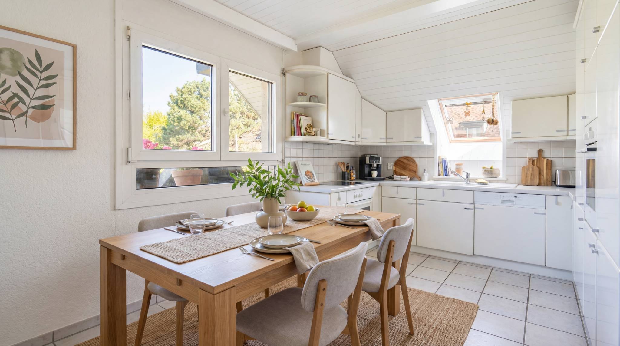 La cuisine ouverte s’intègre naturellement à cet espace de vie, offrant un cadre pratique et convivial.