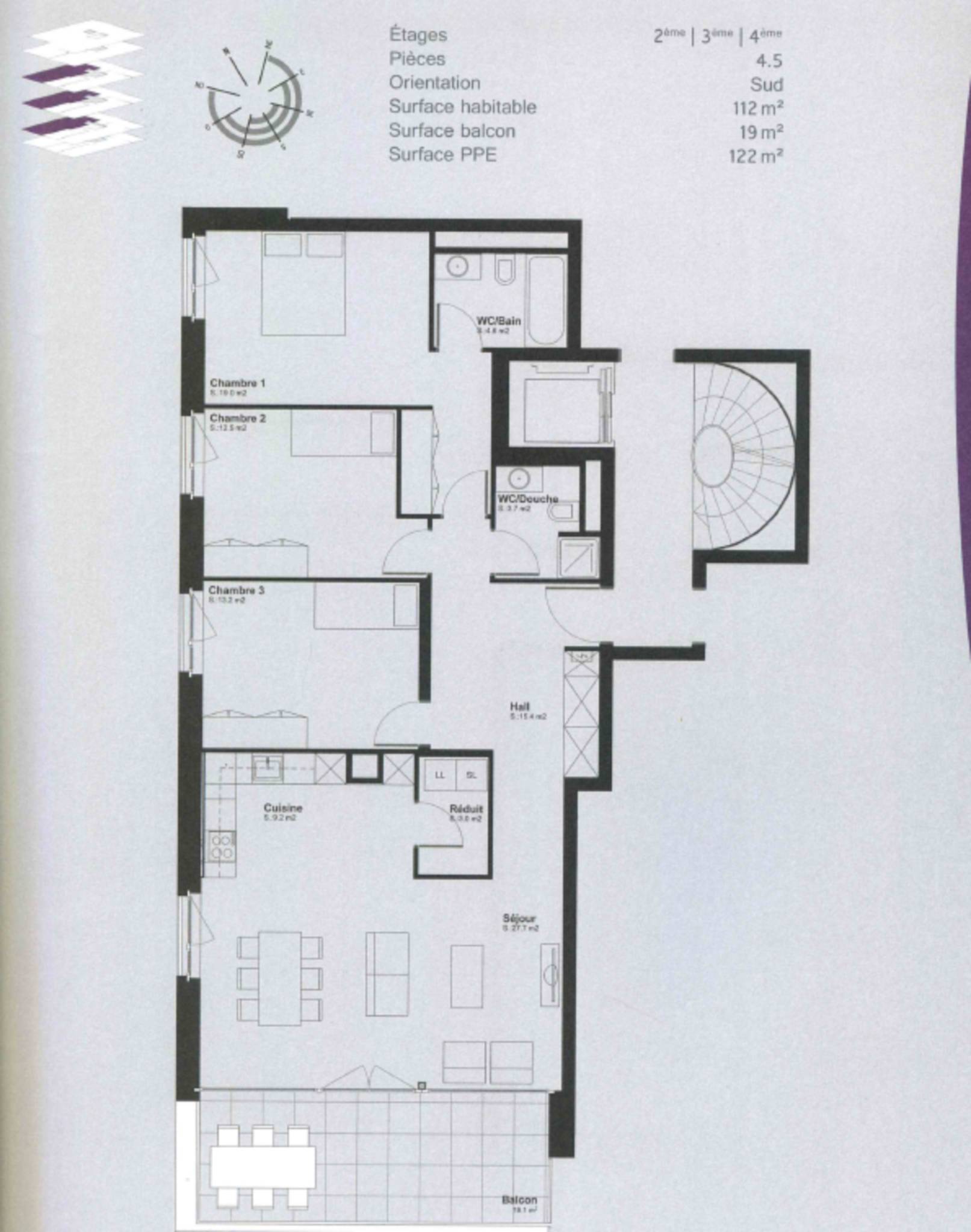 L’appartement se compose d’une spacieuse pièce de vie ouvrant sur un balcon de 19 m², d’une cuisine ouverte entièrement équipée et d’un cellier pratique.