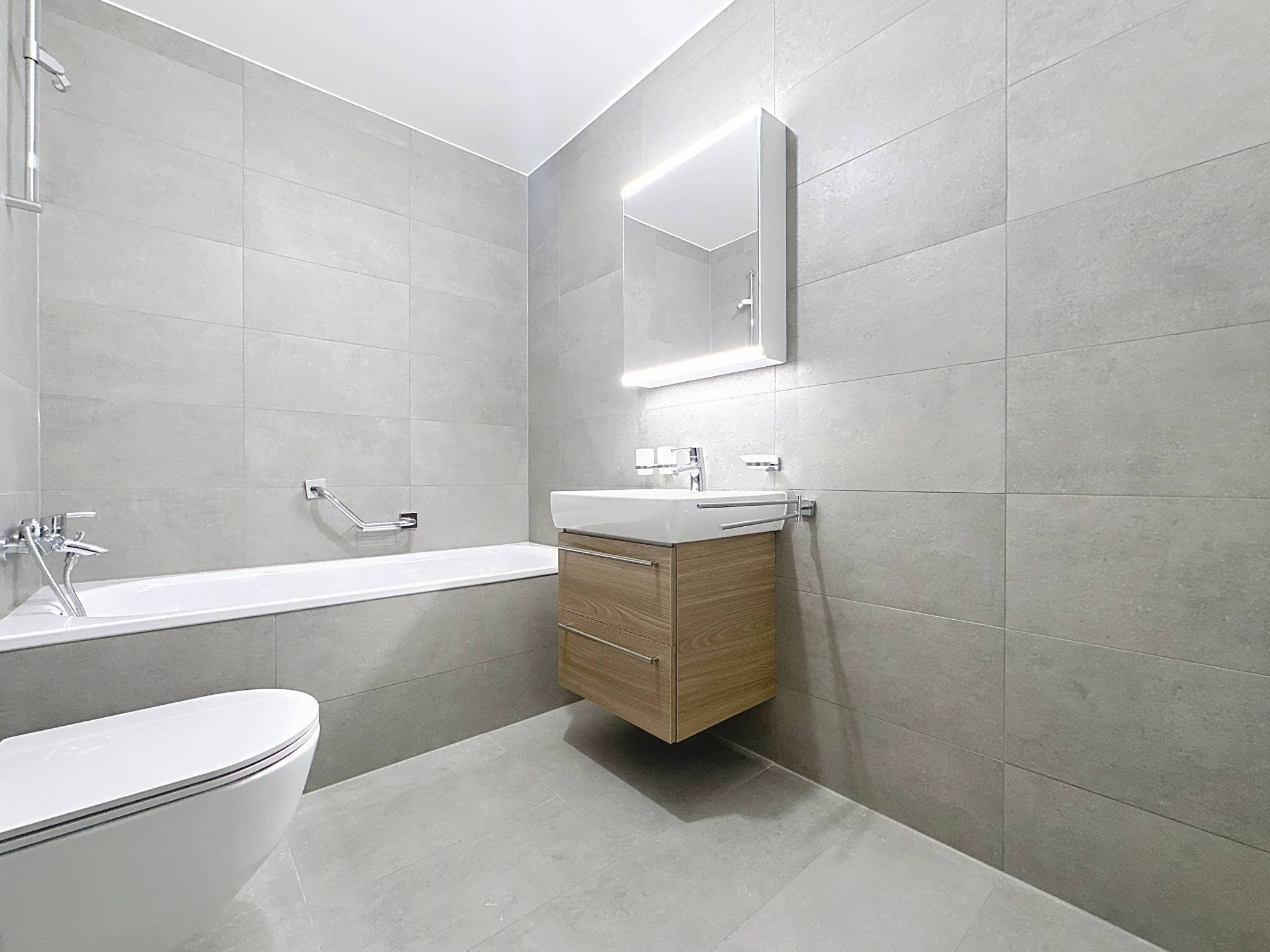Il se compose d'une entrée munie d'armoires murales, d'une cuisine ouverte sur le lumineux séjour avec accès direct à une terrasse de 23.60m2 et un jardin de 51m2. Une grande chambre à coucher et une salle de bains/WC avec possibilité d'installer une colonne de lavage.