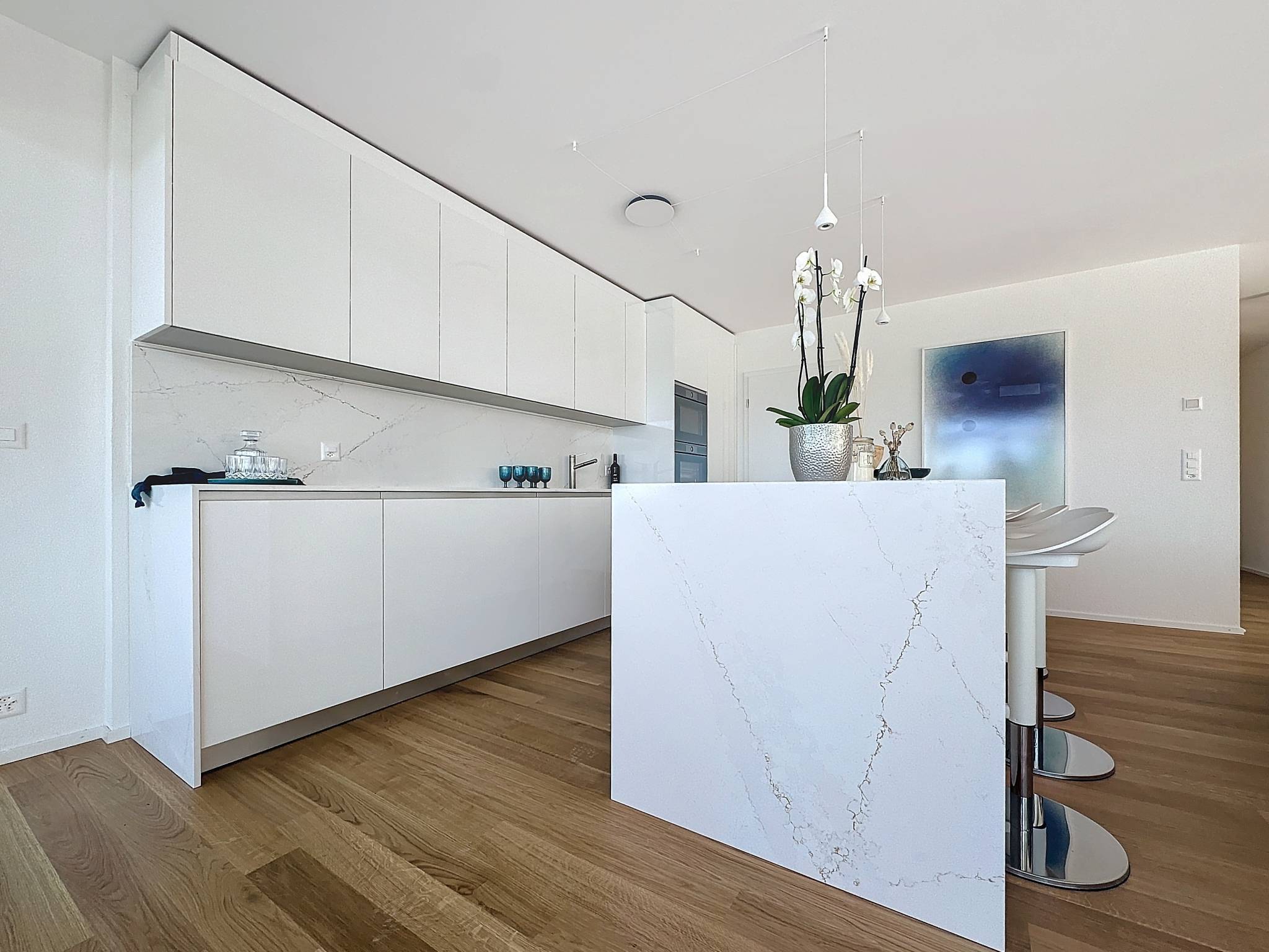 Un hall d'entrée avec une armoire murale desservi directement en ascenseur, un séjour / cuisine ouverte avec îlot central de plus de 60 m2 avec accès au balcon couvert et à la terrasse, une salle de douche, un WC séparé, un couloir mène à la zone nuit avec trois chambres à coucher et une chambre parentale avec une salle de bain attenante et un dressing. Les quatres chambres ont accès aux extérieurs. Une buanderie avec arrivées d'eau pour la colonne de lavage. Un réduit.