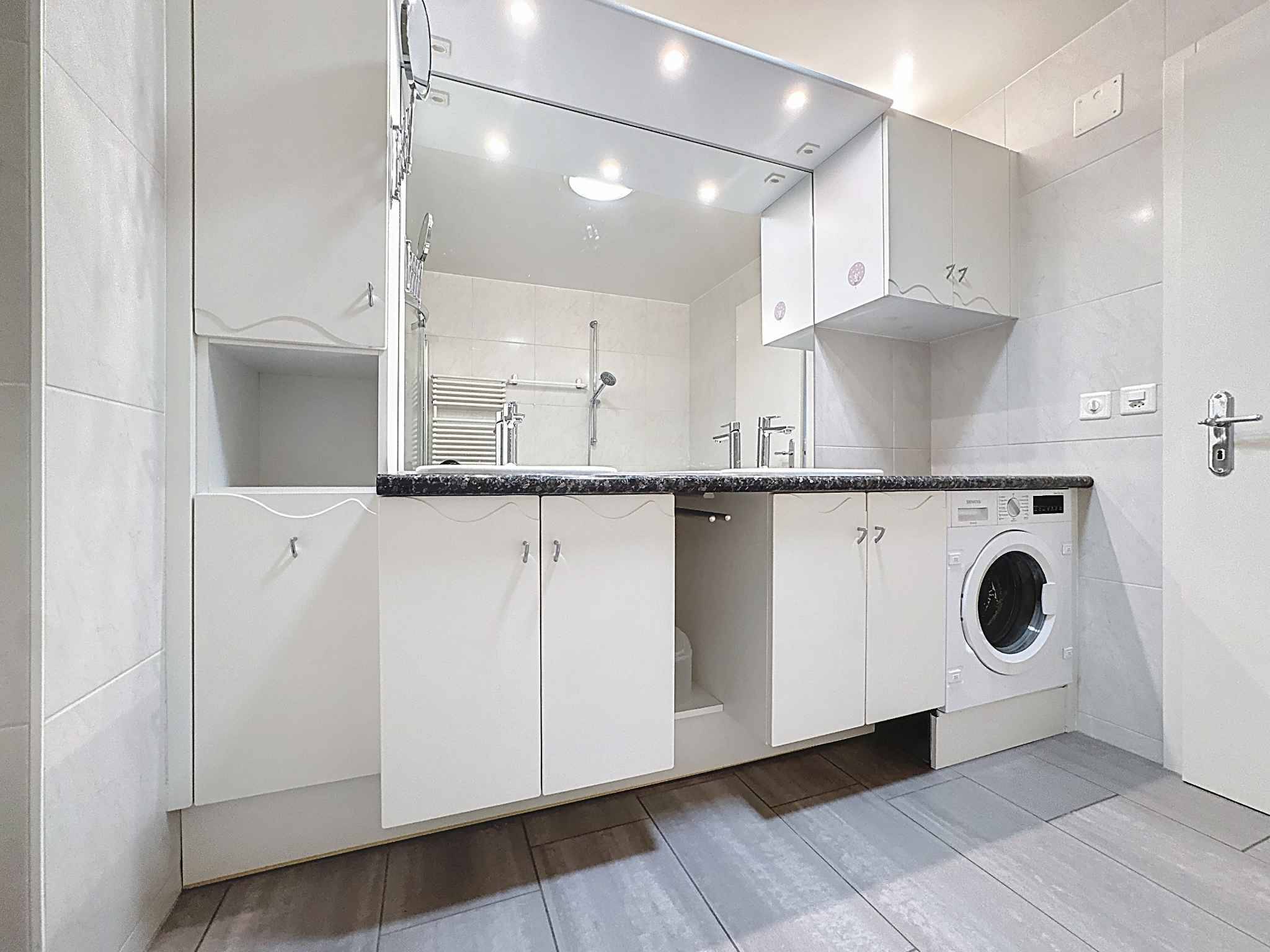 Un hall d’entrée mène vers une élégante pièce de vie composée d’une cuisine ouverte, d’un espace salle à manger et d’un vaste séjour baigné de lumière. Cet espace s’ouvre sur un balcon idéal pour profiter du panorama. Un WC visiteurs complète cette partie.