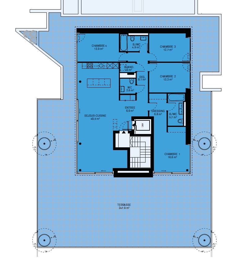 Un hall d'entrée avec armoires murales desservi directement par un ascenseur, un grand séjour / cuisine ouverte donnant sur une terrasse de plus de 247m2, une salle de bains, un WC séparé, 3 chambres à coucher, une chambre parentale avec salle de bains attenante et un dressing, une buanderie avec arrivées d'eau pour la colonne de lavage. Toutes les chambres ont accès à la terrasse qui fait le tour de l'appartement.