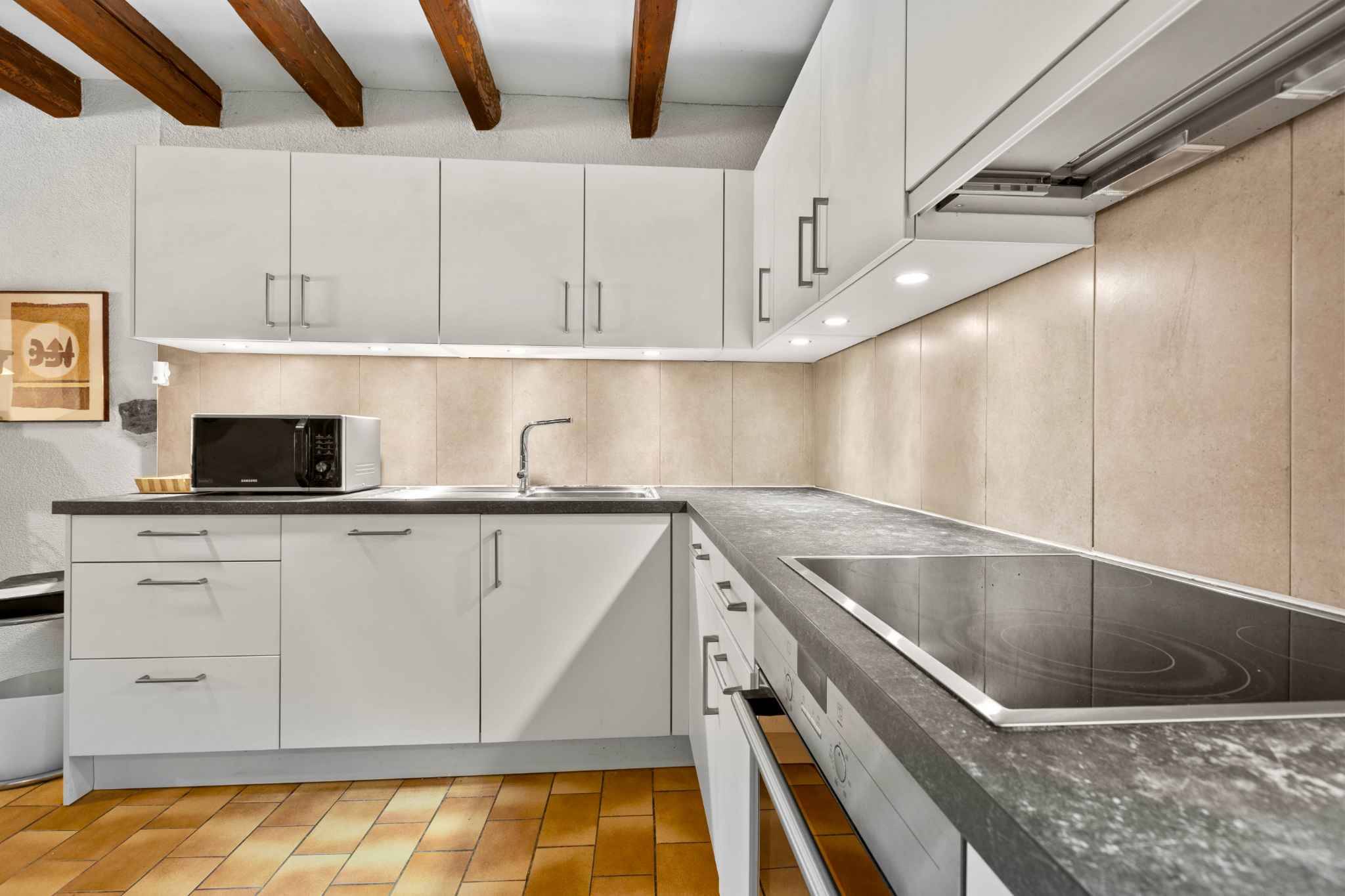 Les volumes sont généreux, la distribution harmonieuse, et les belles poutres apparentes confèrent un cachet authentique à l’ensemble. La hauteur sous plafond renforce la sensation d’espace et la mezzanine, polyvalente, peut accueillir un bureau, un coin lecture ou une chambre d’appoint.