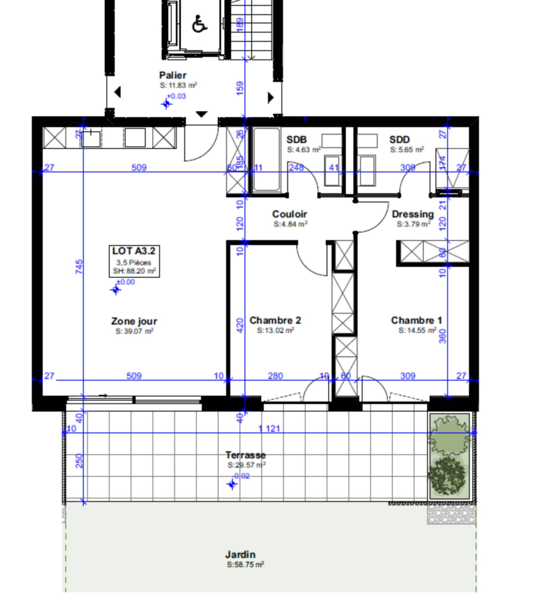 Cet appartement de 3.5 pièces, orienté sud, propose 88 m² habitables, prolongés par une superbe terrasse de 30 m² et un jardin privatif de 59 m².
