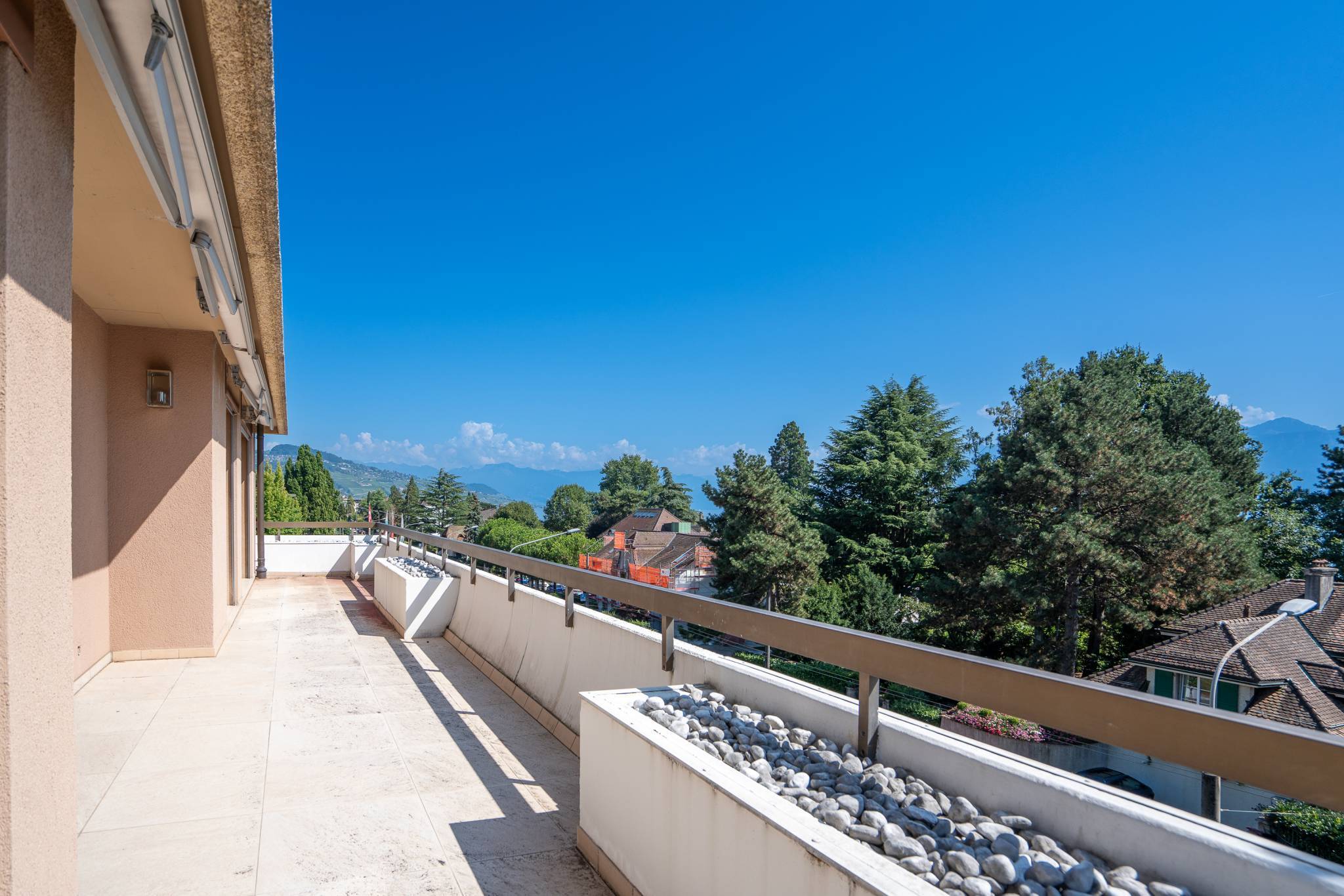 Profitez d'un beau dégagement sur le lac et les montagnes depuis les généreuses terrasses orientées plein sud et ouest, totalisant 60 m². Cet espace extérieur, accessible depuis le séjour et la salle à manger, est idéal pour savourer les journées ensoleillées.