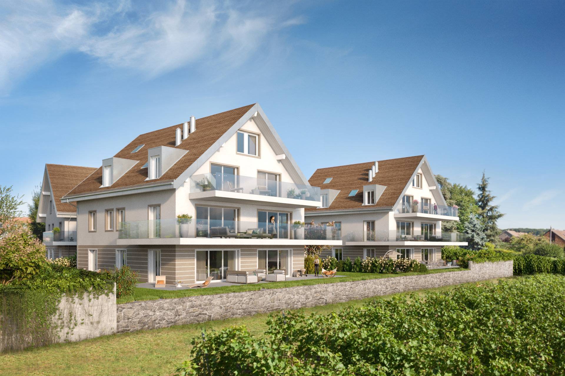 3 bâtiments neufs construits dans un cadre bucolique composés de 12 appartements sur plans allant de 3.5 à 5.5 pièces.