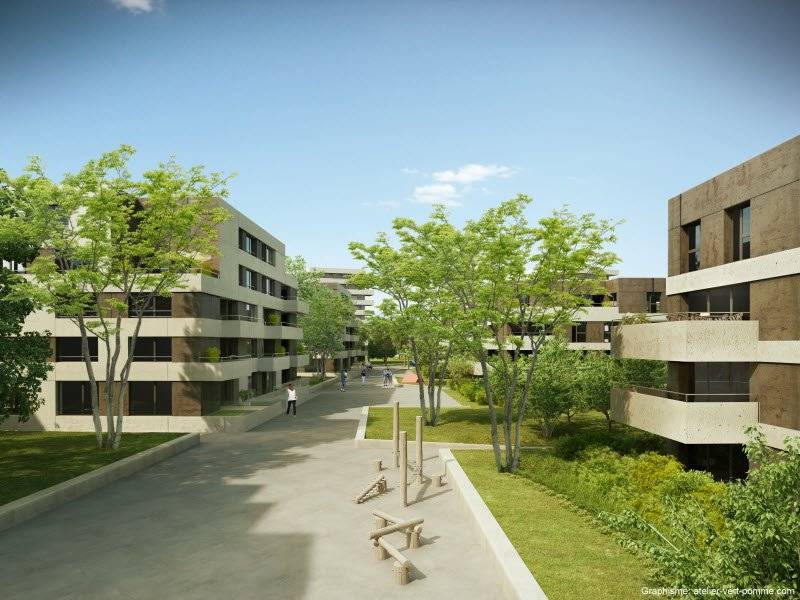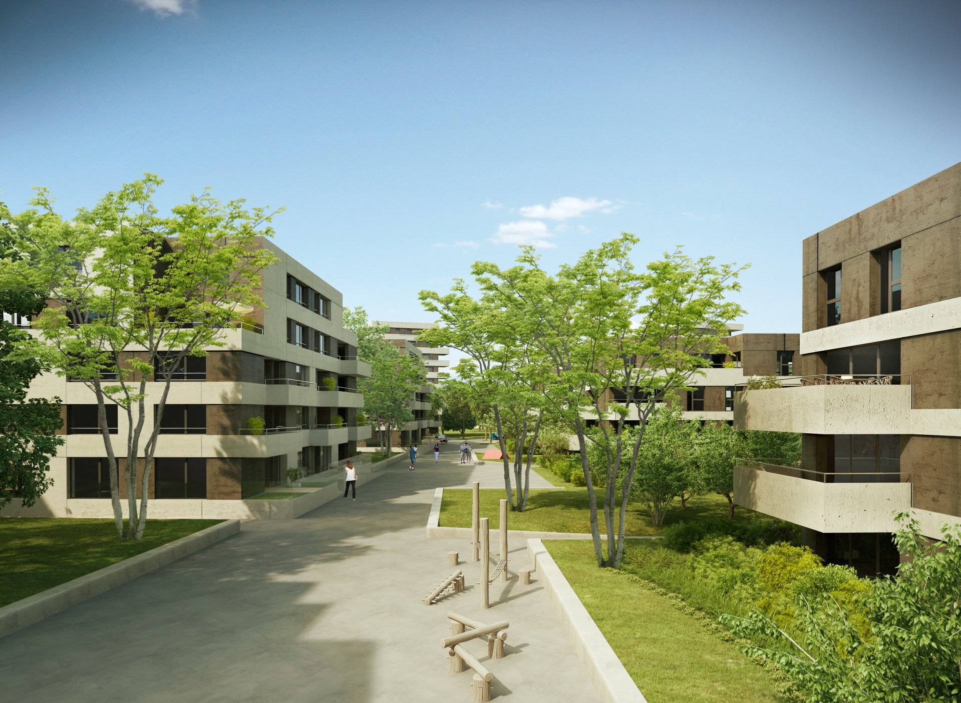 Son intégration sera garantie par laménagement de nombreux espaces verts, des espaces de jeux, une arborisation importante et des infrastructures telles quun système de desserte de transport, des pistes cyclables, un nouveau complexe sportif et de nouvelles écoles. Ces espaces extérieurs de qualité offrent un caractère convivial à lensemble et couvriront les besoin de tous et de la famille.