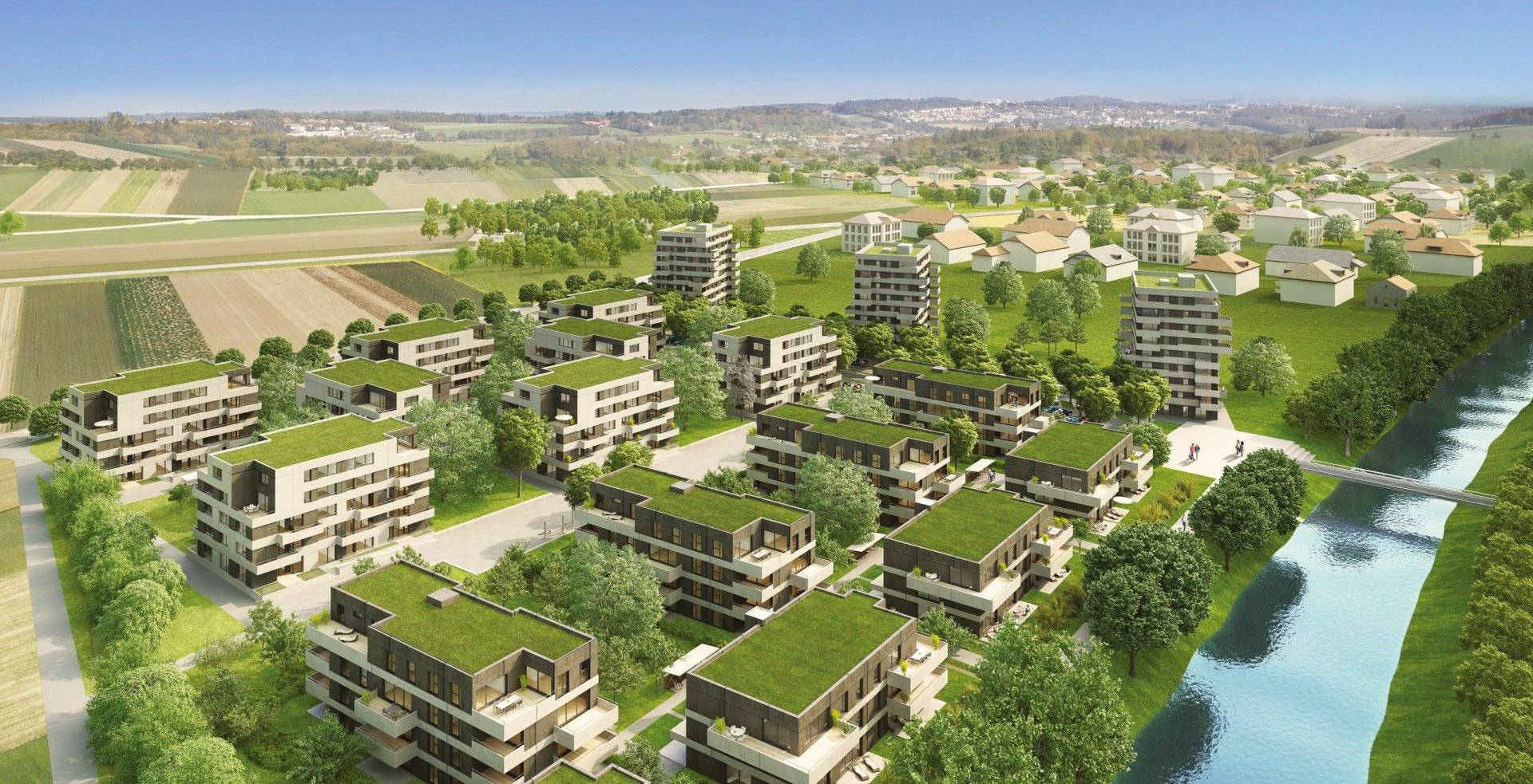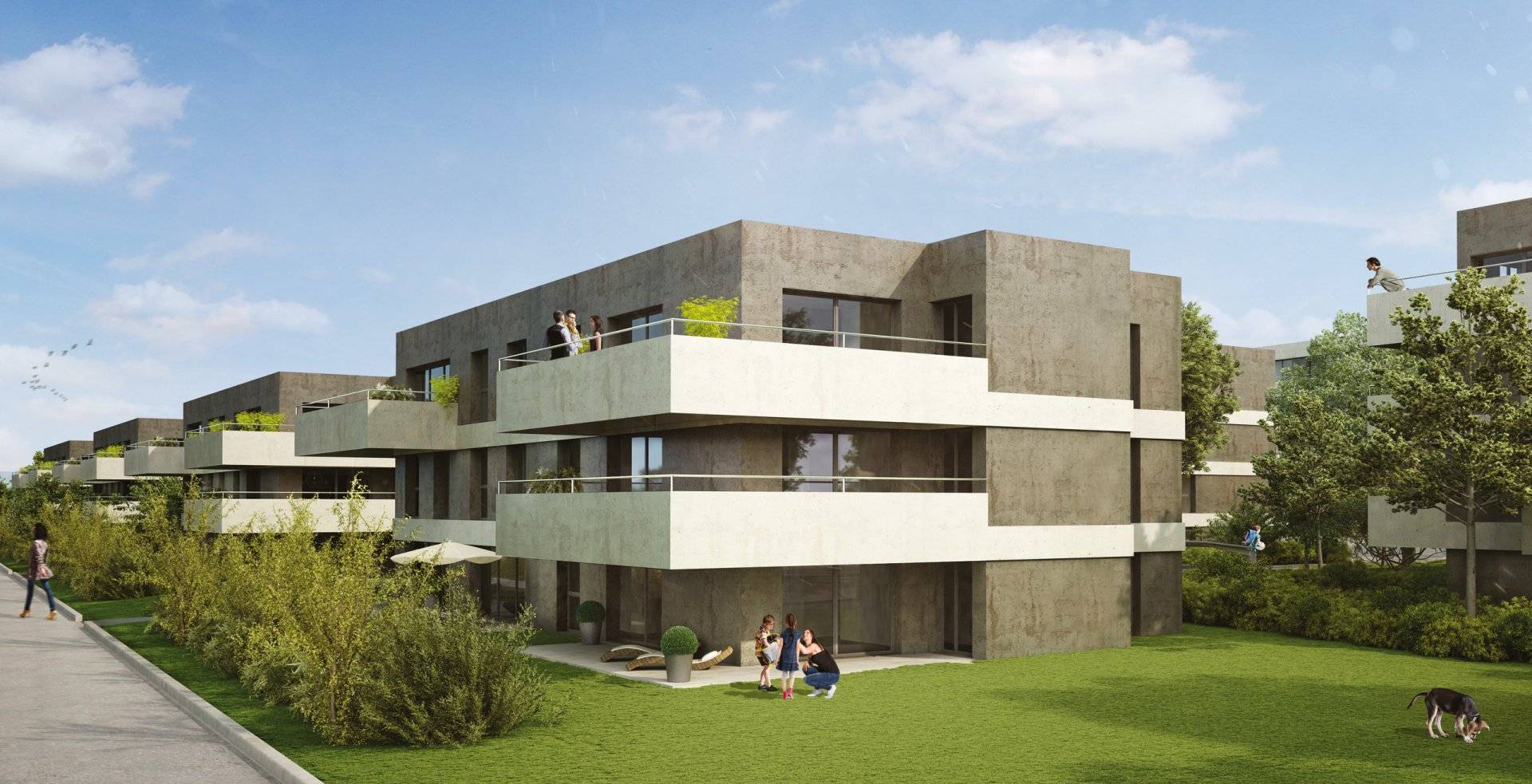 Ces immeubles résidentiels labélisés Minergie à haute qualité environnementale et de construction sont pensés dans une architecture moderne et illustrent le caractère écologique du projet avec ses toitures plates végétalisées.