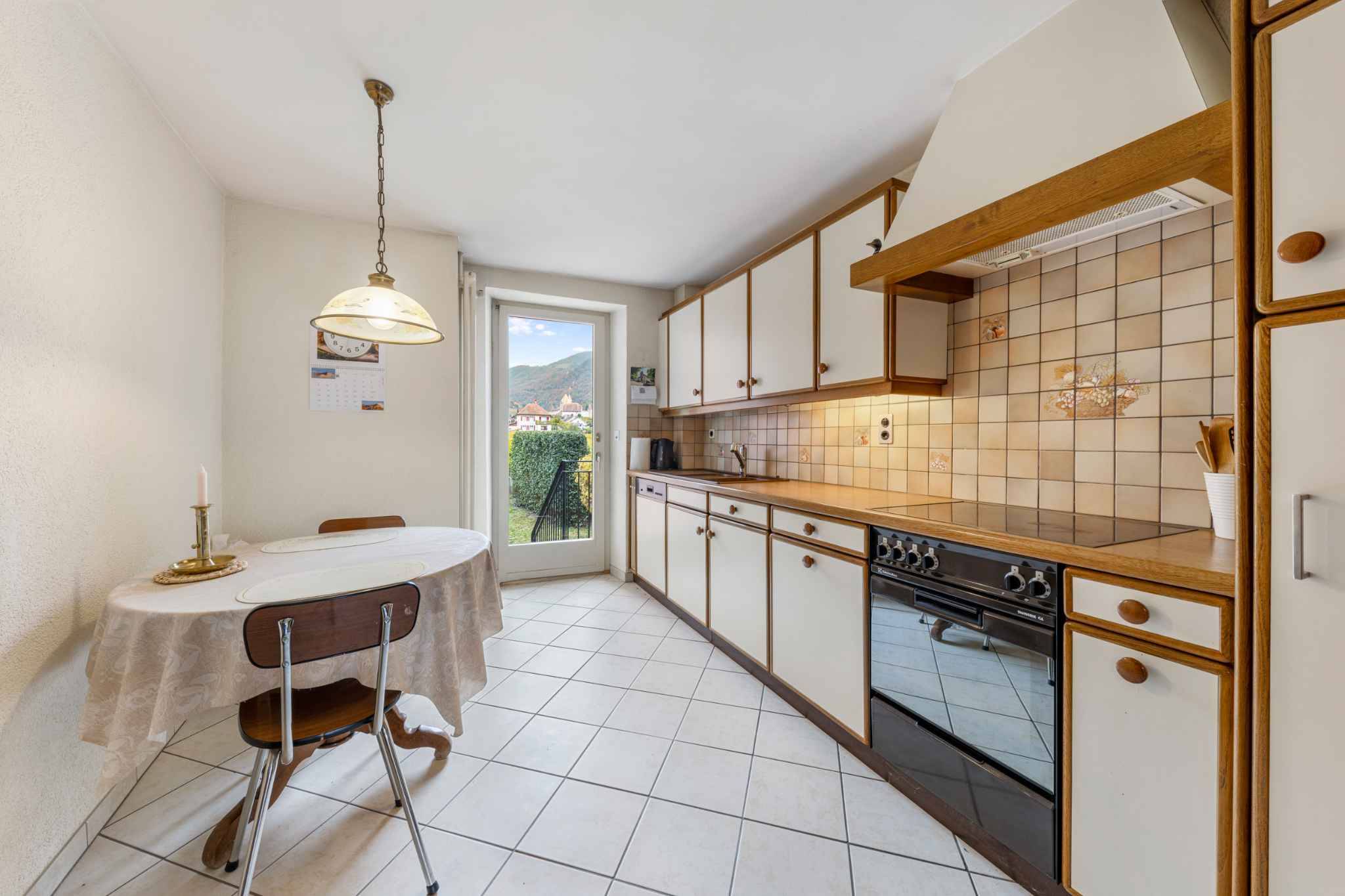 Cuisine fermée avec accès à la terrasse par un petit escalier