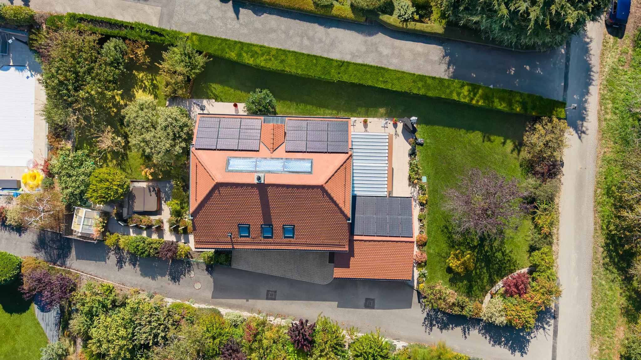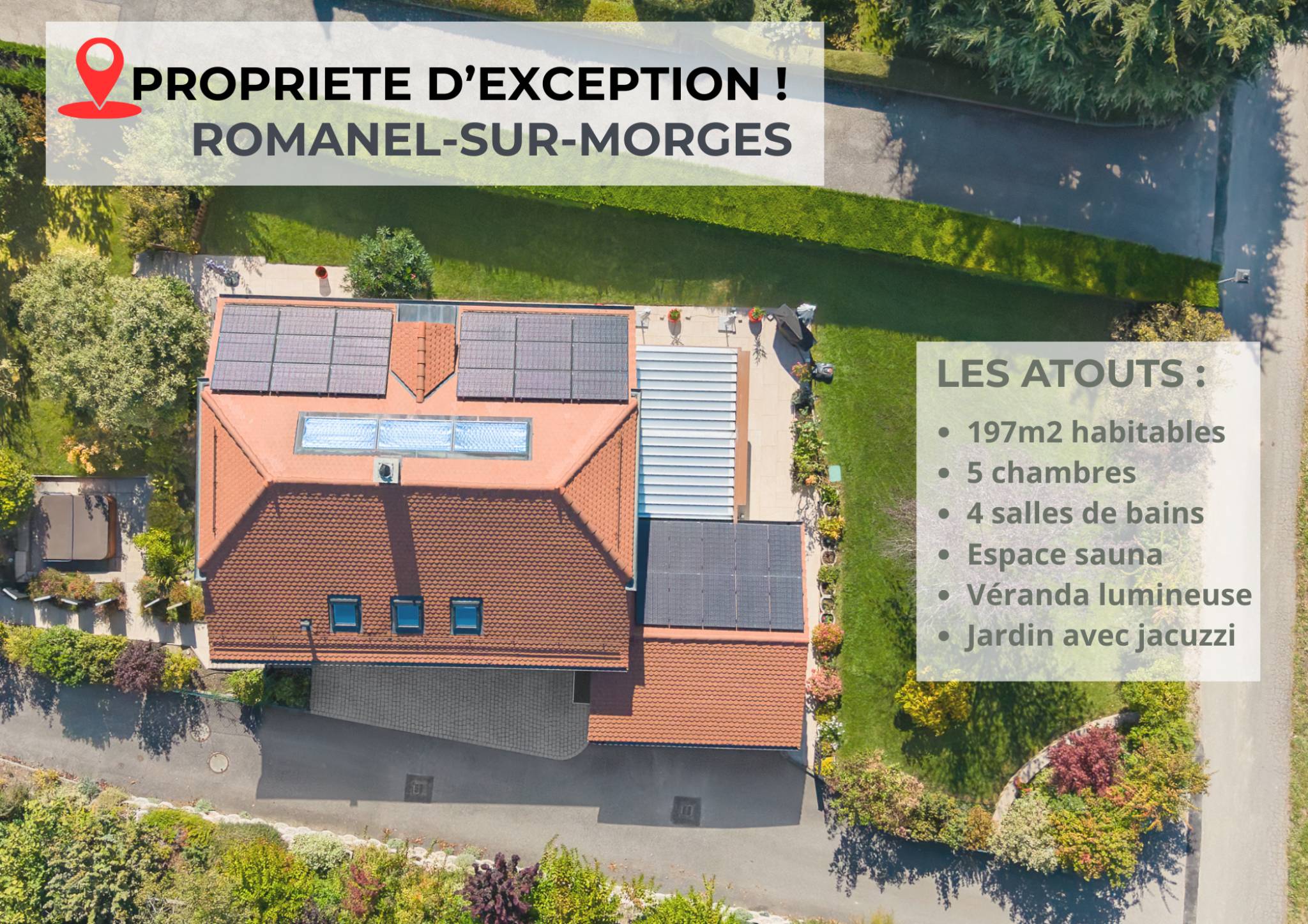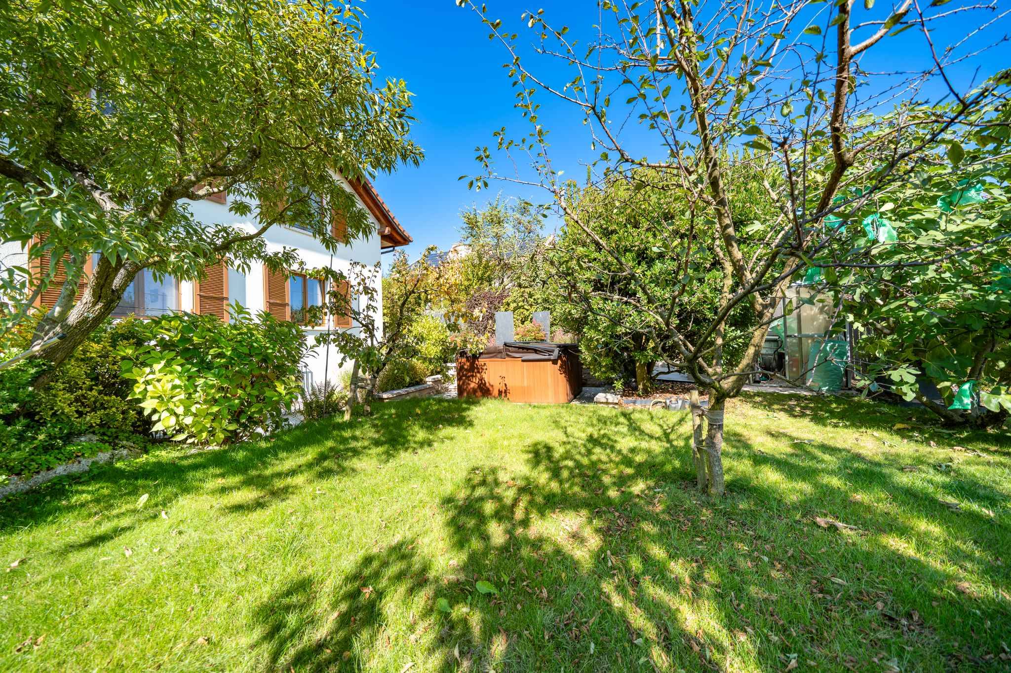 A l’extérieur le jardin arboré, soigneusement entretenu, est agrémenté d’un jacuzzi, invitant à la détente tout au long de l’année. Son exposition plein sud garantit une luminosité optimale du matin au soir.