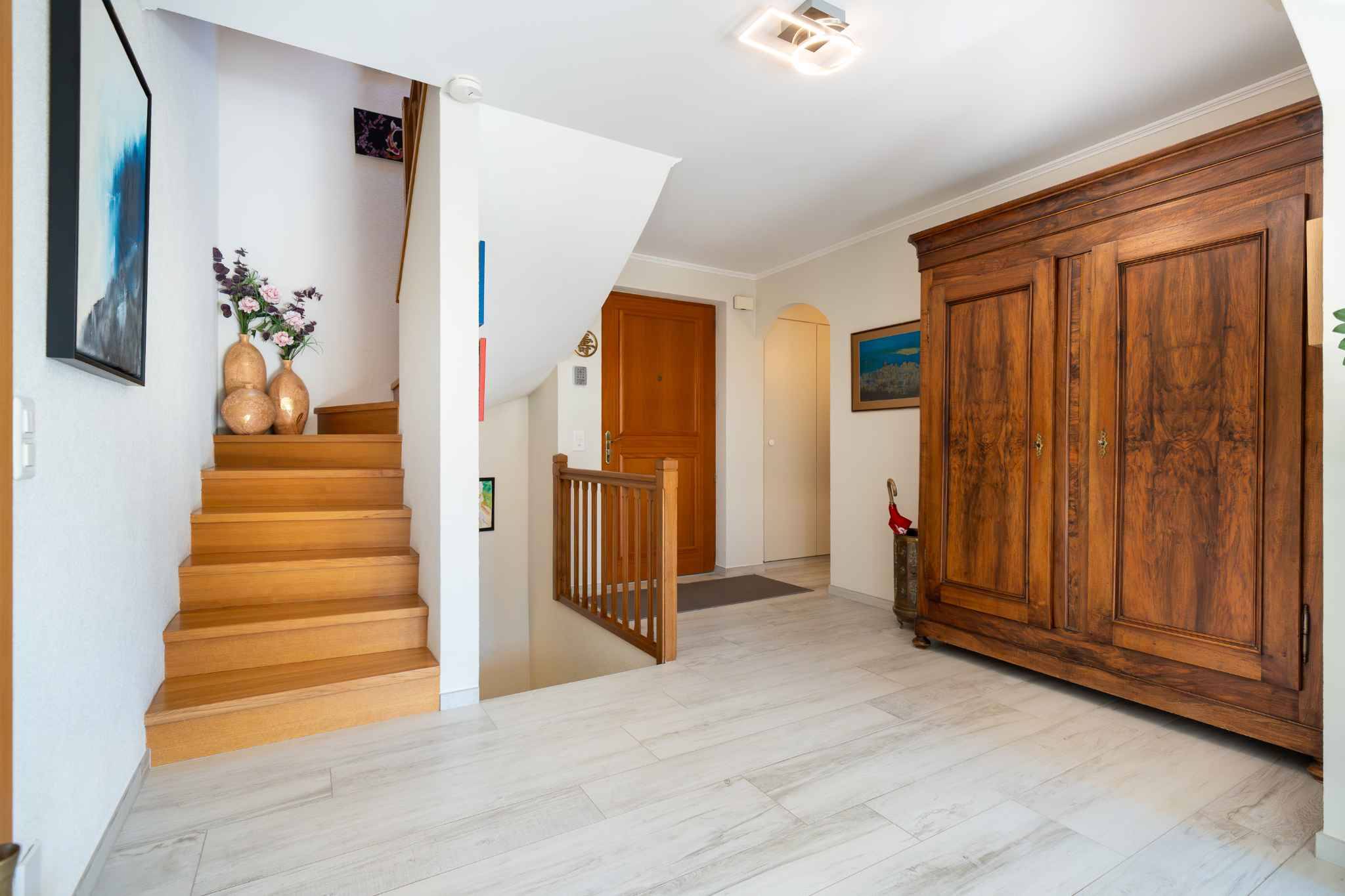 Rez-de-chaussée : Une belle entrée s’ouvre sur un vaste hall de distribution menant à un double séjour avec cheminée, à une cuisine partiellement ouverte sur la salle à manger ainsi qu’à une véranda lumineuse. Un espace avec armoires murales et des WC visiteurs complètent ce niveau. Toutes les pièces offrent un accès direct à l’extérieur.