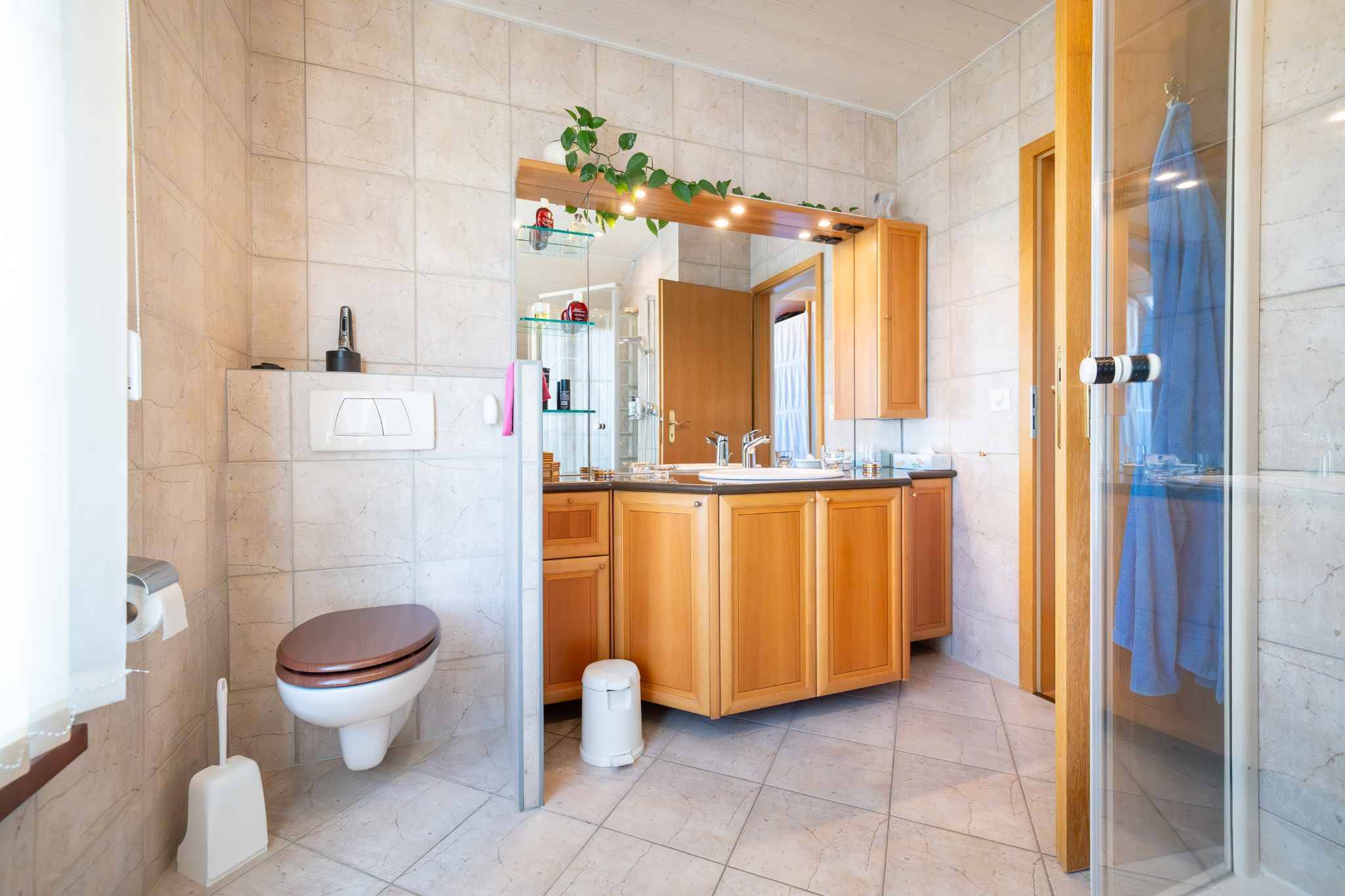 Rez-de-chaussée : Une belle entrée s’ouvre sur un vaste hall de distribution menant à un double séjour avec cheminée, à une cuisine partiellement ouverte sur la salle à manger ainsi qu’à une véranda lumineuse. Un espace avec armoires murales et des WC visiteurs complètent ce niveau. Toutes les pièces offrent un accès direct à l’extérieur.