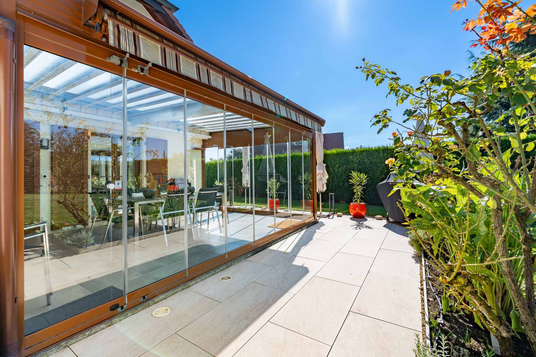 A l’extérieur le jardin arboré, soigneusement entretenu, est agrémenté d’un jacuzzi, invitant à la détente tout au long de l’année. Son exposition plein sud garantit une luminosité optimale du matin au soir.