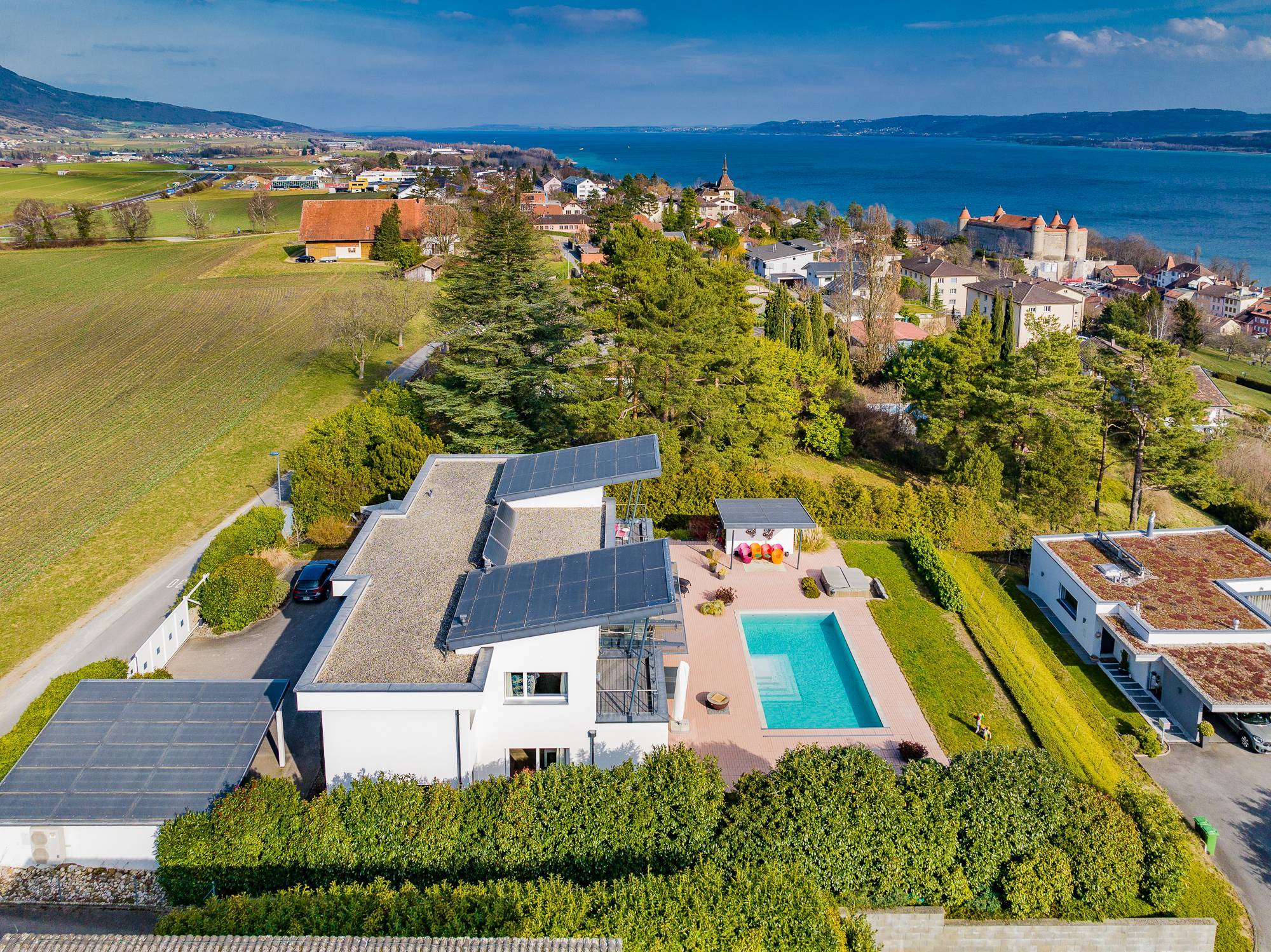 Moderne, imposante et à l’intérieur chaleureuse, cette demeure de 7.5 pièces offre une vue à couper le souffle sur le lac de Neuchâtel et les Alpes.