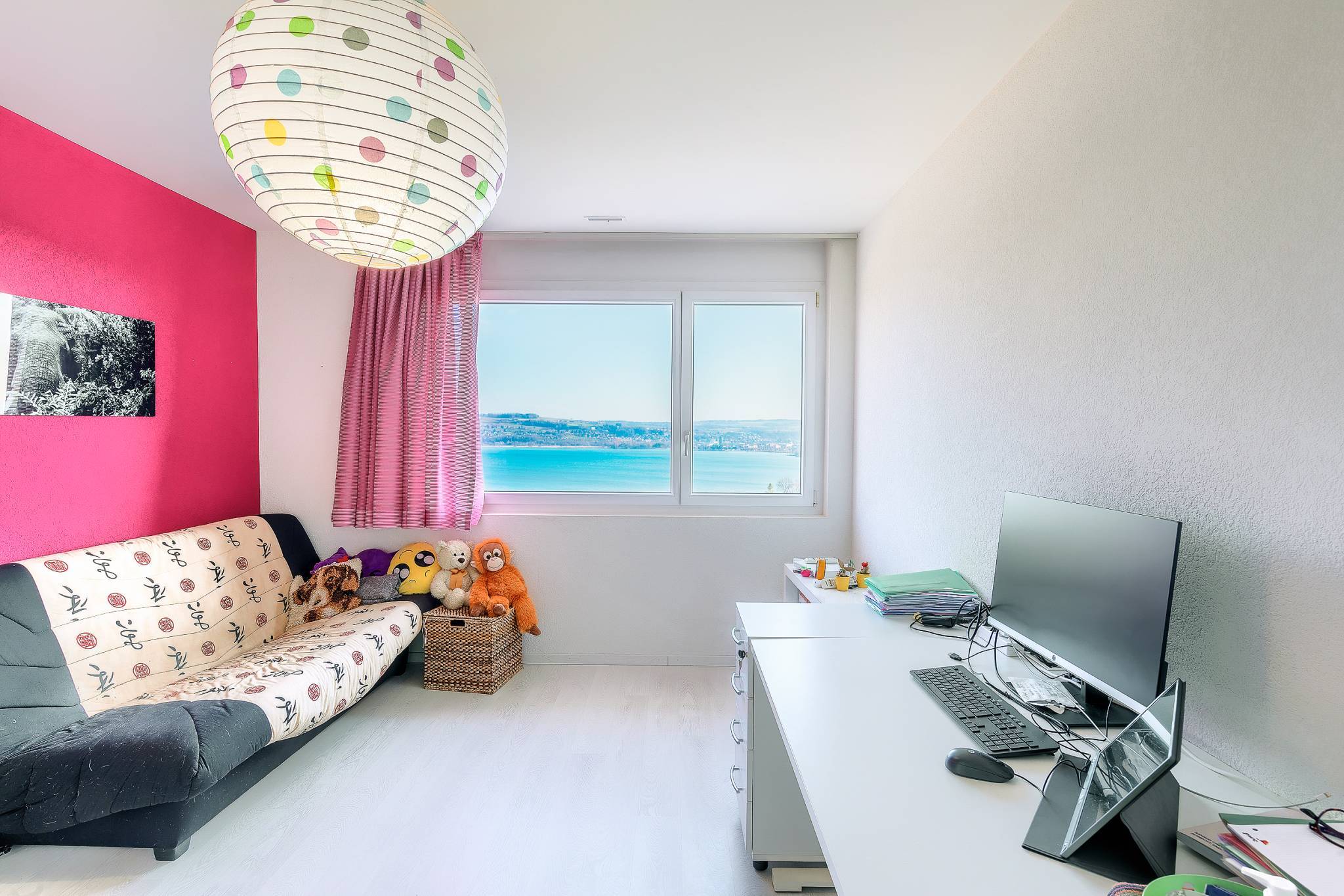 Le rez-de-chaussée :Une entrée majestueuse avec deux escaliers donnant accès à l'étage supérieur, un grand séjour double avec de grandes baies vitrées, un espace aménageable en coin TV/home cinéma avec sound system, une salle à manger et une cuisine séparée entièrement agencée avec îlot central et cellier. Toutes les pièces de vie ont un accès direct à la terrasse et offrent une vue imprenable sur le lac et les Alpes. Un vestibule avec armoires murales, WC séparés et une première chambre à coucher en suite avec salle de douches/WC privative complètent ce niveau.