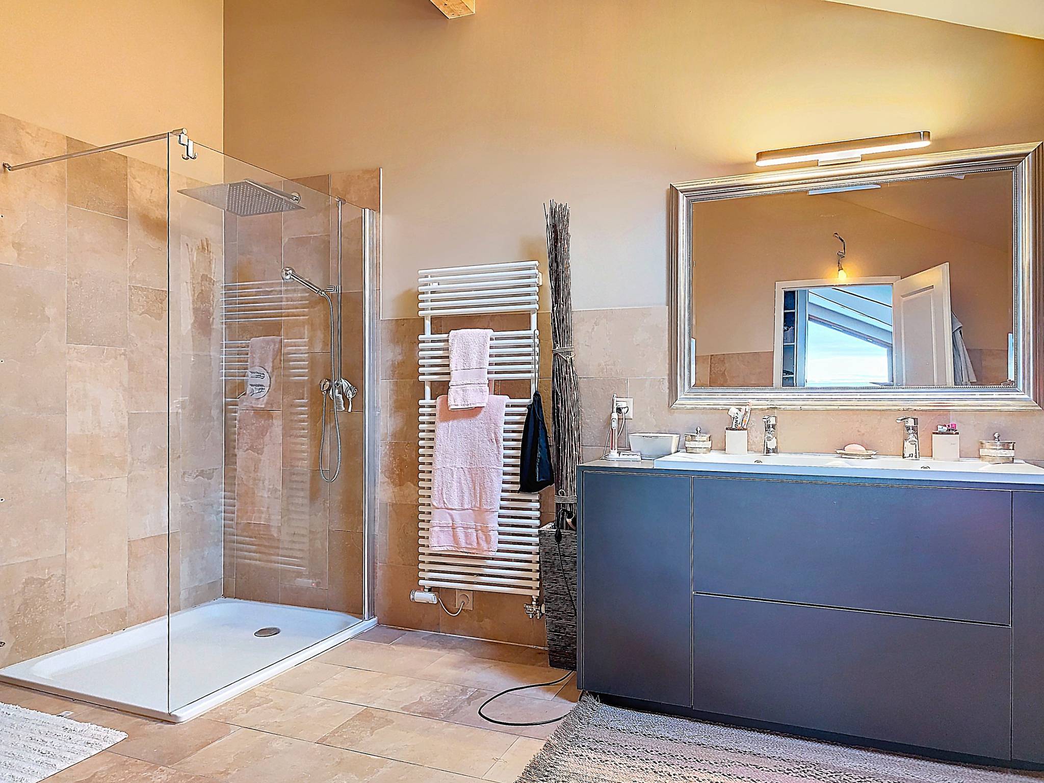 Intégré à la maison, un espace indépendant avec chambre et cuisine offre un espace polyvalent, parfait pour accueillir des invités ou créer un lieu de travail/vie autonome. Le rez-de-chaussée comprend également une chambre d’amis et un WC visiteurs, ajoutant confort et praticité pour vos hôtes.