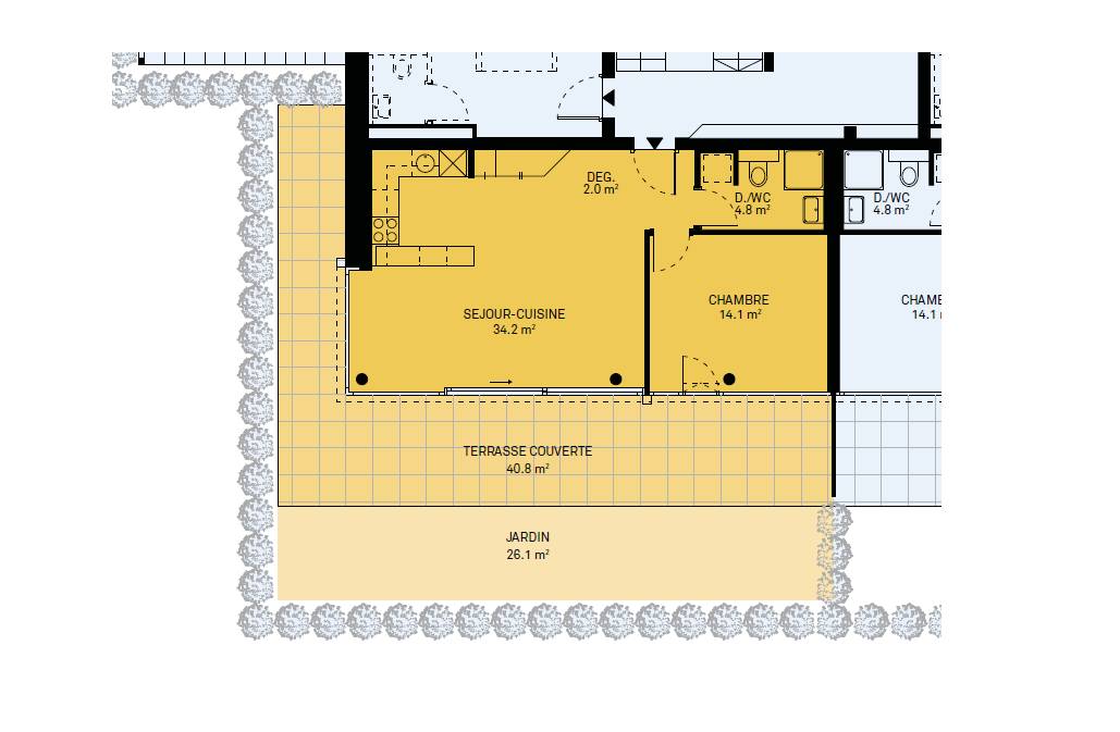 Cet appartement de 2.5 pièces se trouve au rez-de-chaussée du bâtiment B1 Centre.