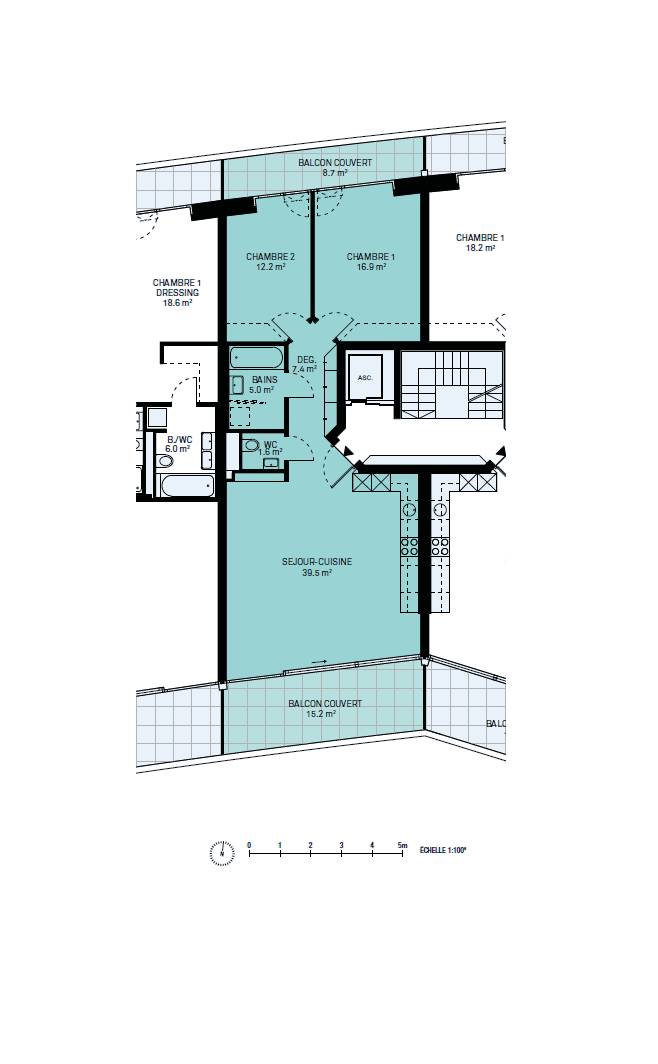 Un hall d'entrée avec armoires murales, un séjour / cuisine de plus de 39m2 qui donne sur un premier balcon couvert, une salle de bain avec arrivées d'eau pour la colonne de lavage, un WC séparé, deux chambres avec accès au deuxième balcon couvert.