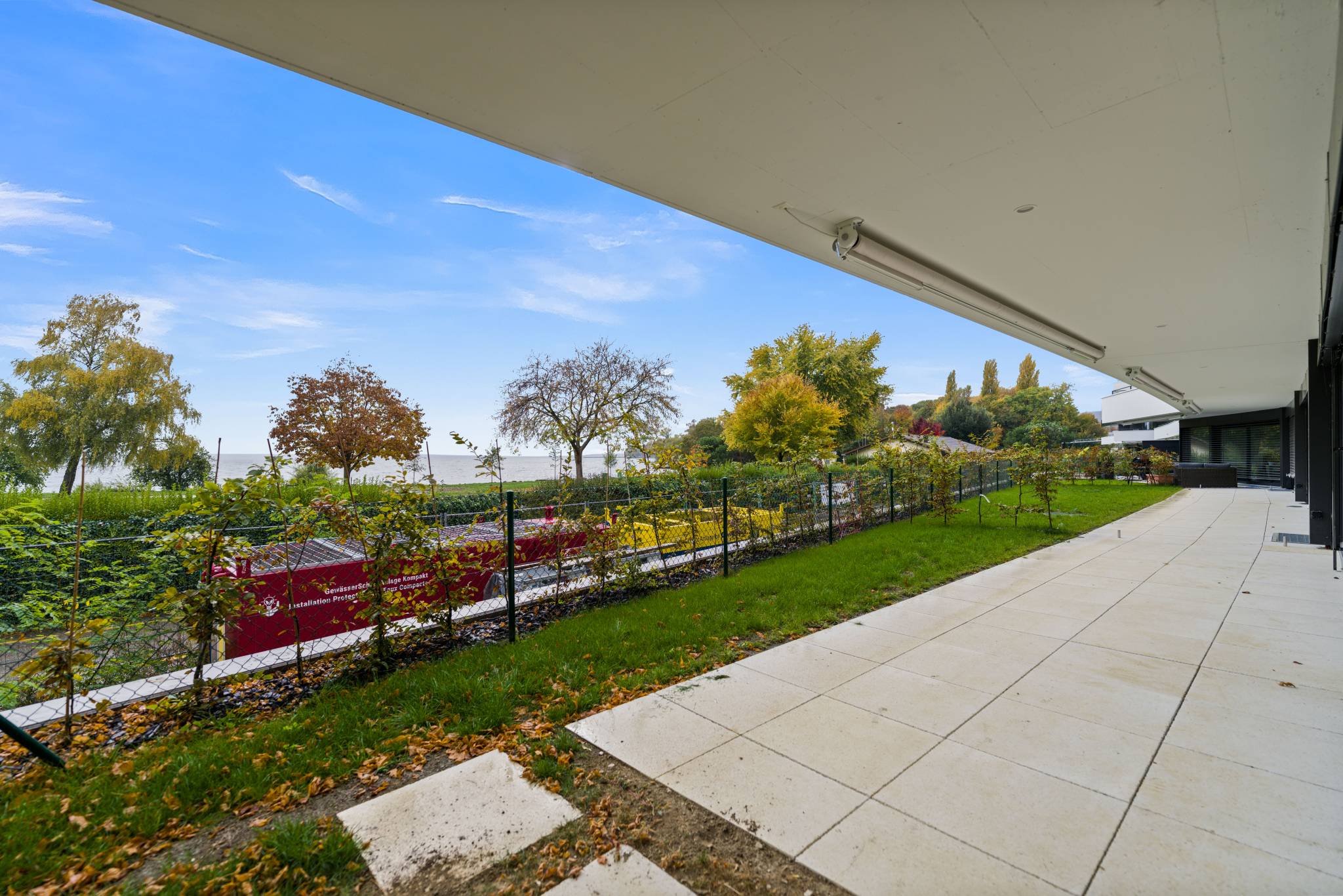 La résidence propose des appartements allant du 1.5 pièces au 5.5 pièces en attique ou avec jardin, offrant de magnifiques vues sur le lac et les Alpes.