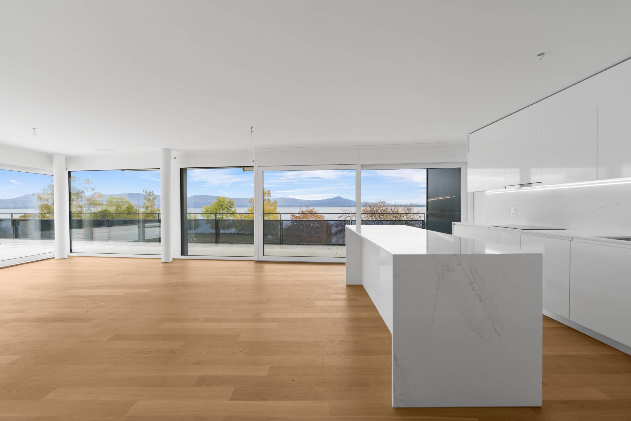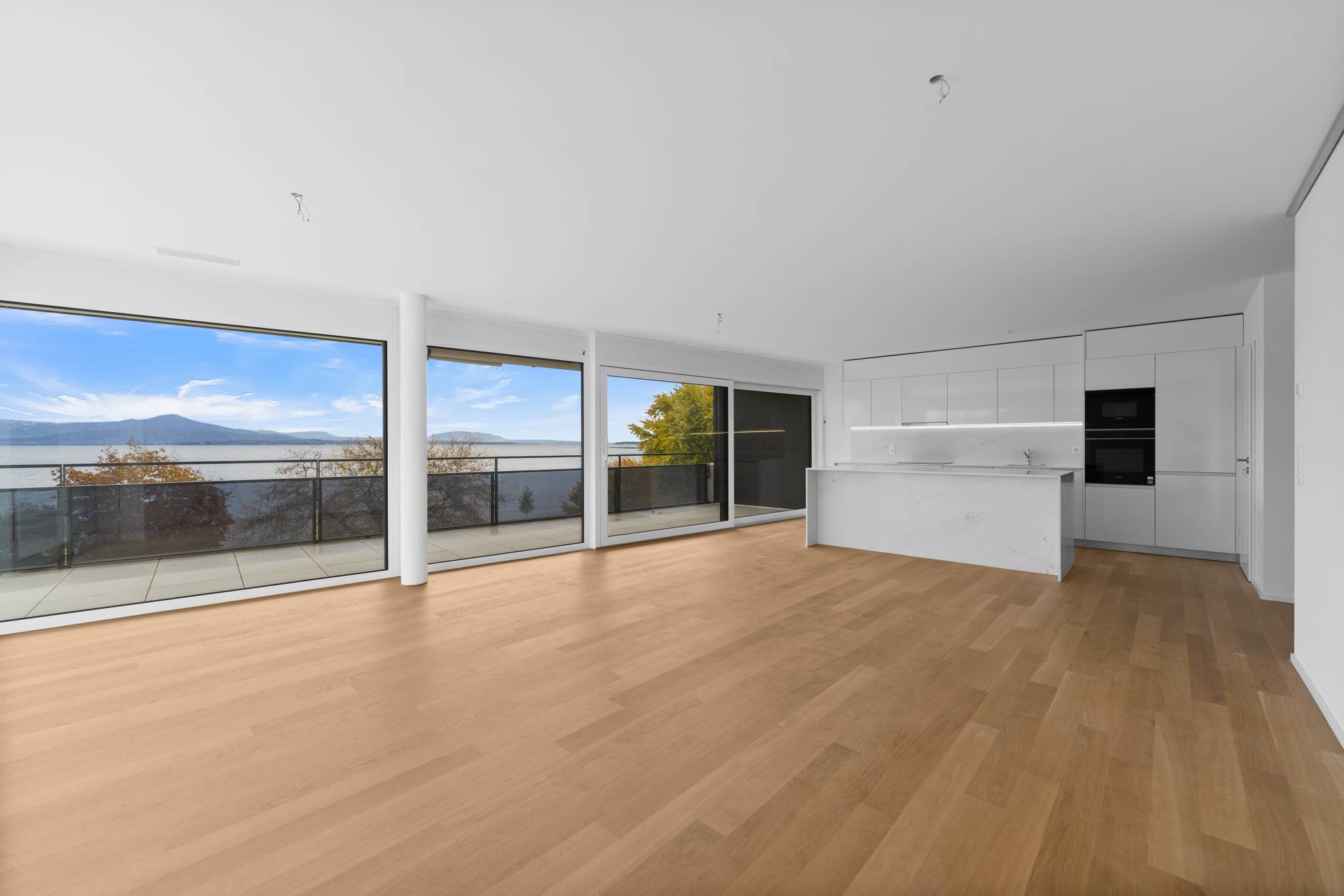 La résidence propose des appartements allant du 1.5 pièces au 5.5 pièces en attique ou avec jardin, offrant de magnifiques vues sur le lac et les Alpes.