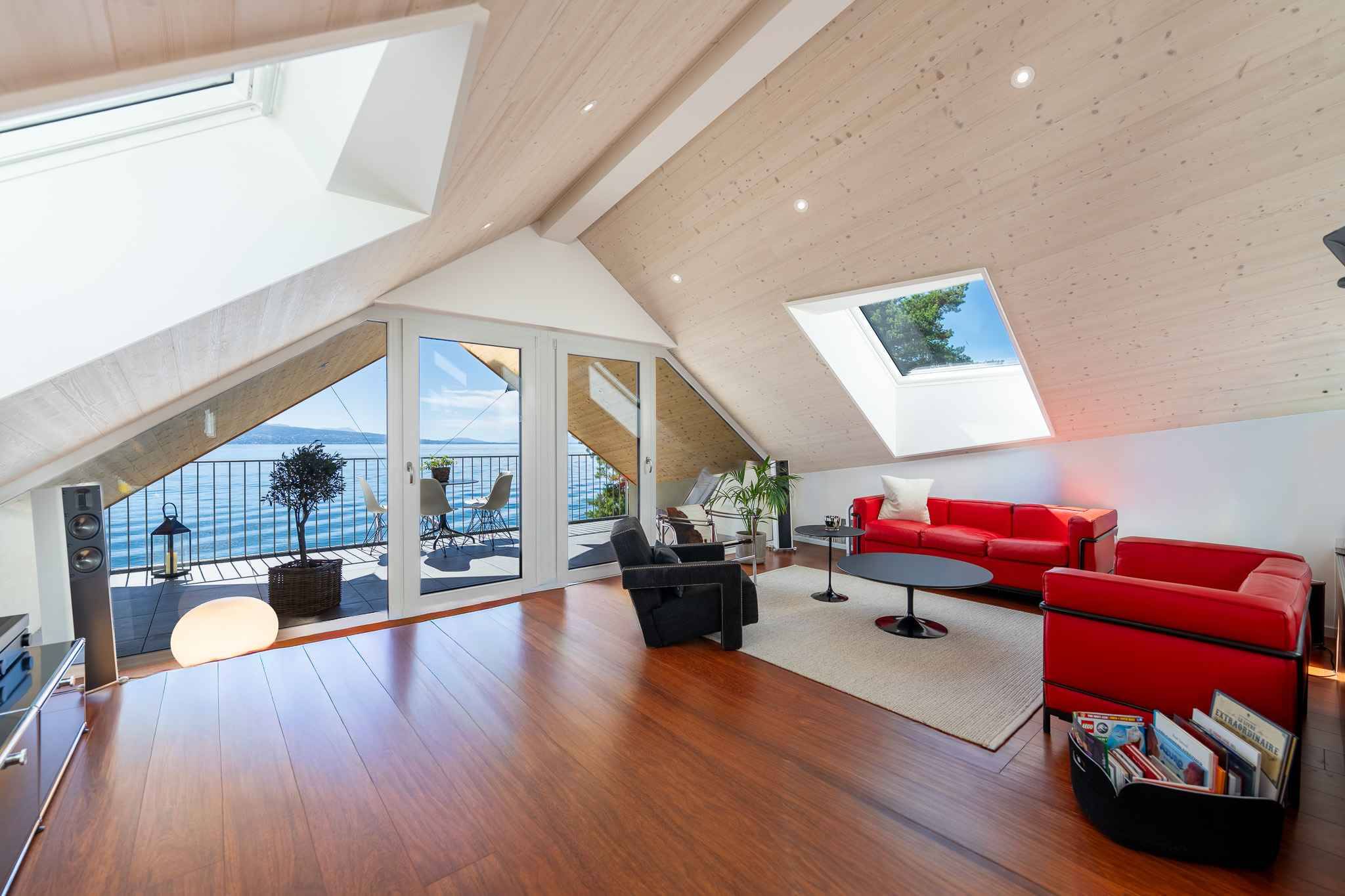 The 5.5-room duplex: This duplex, directly accessible by a private elevator, comprises a large, bright living room opening onto the garden with a magnificent view of the lake and mountains. A bedroom/study, a cinema room, a bathroom and a laundry area complete this level.
