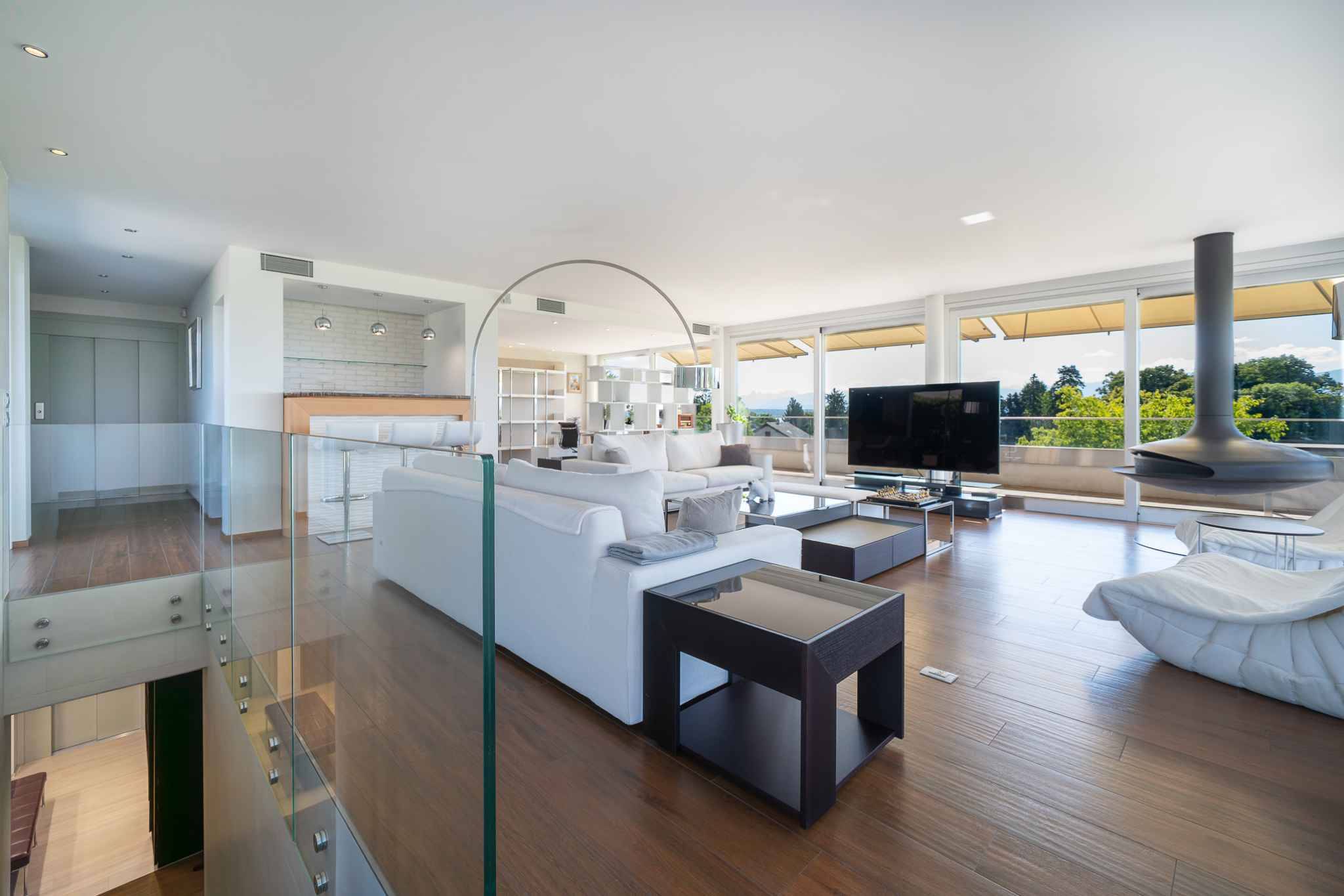 Le 3ème et dernier étage est composé d'un séjour avec bar et bureau attenant. La spacieuse terrasse en Tek avec ses divers espaces cosy comme la cuisine d'extérieure avec son bar, le grand jacuzzi, le tout à l'abri des regard et offre une belle vue sur le lac et les montagnes voisines.