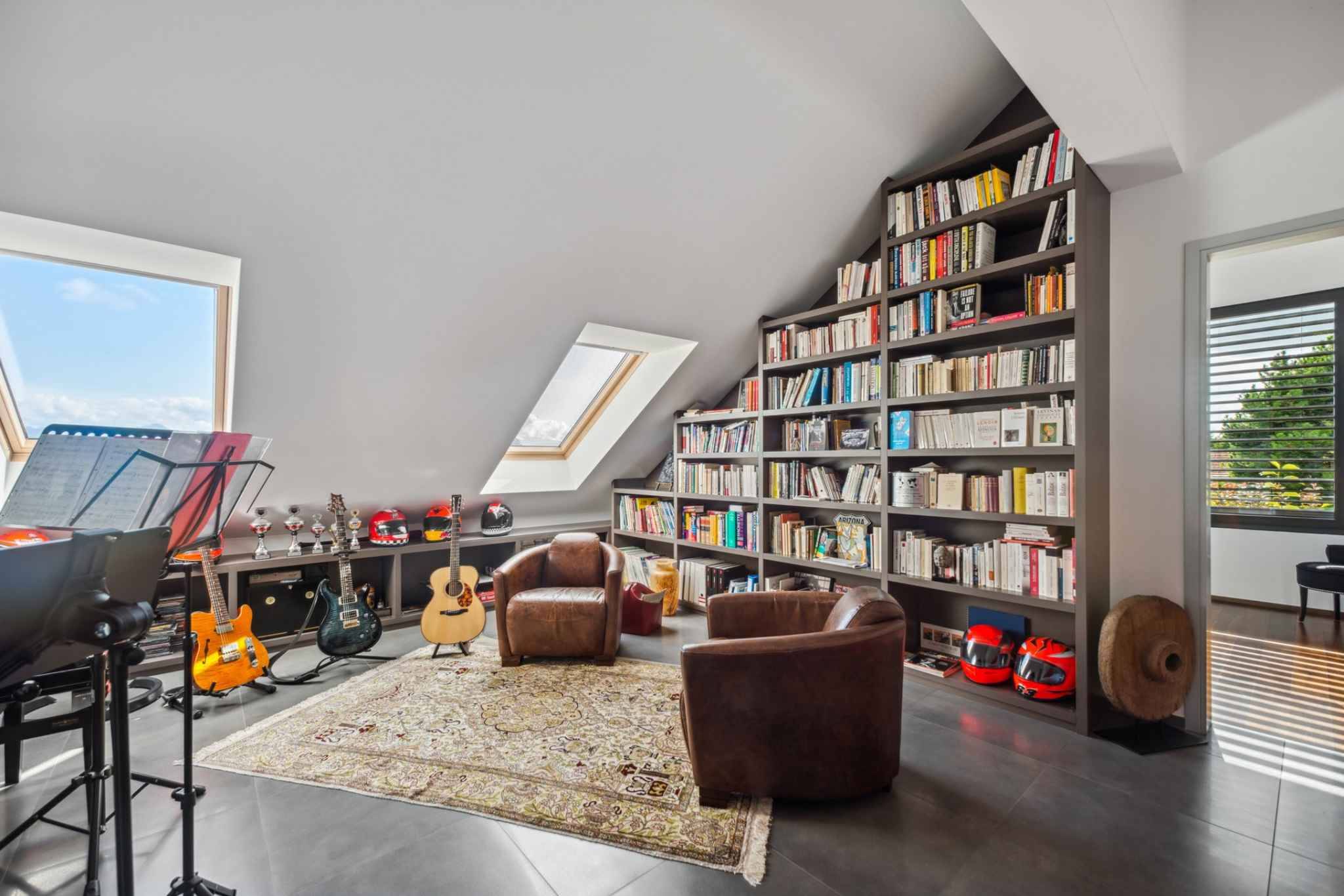 Le volume généreux de la maison (1500m³) offre de belles pièces de vie comme le salon avec sa cheminée et sa belle hauteur sous plafond, ses impressionnantes grandes baies vitrées, sa grande cuisine haut de gamme, etc... et dispose de 4 chambres à coucher à l'étage.