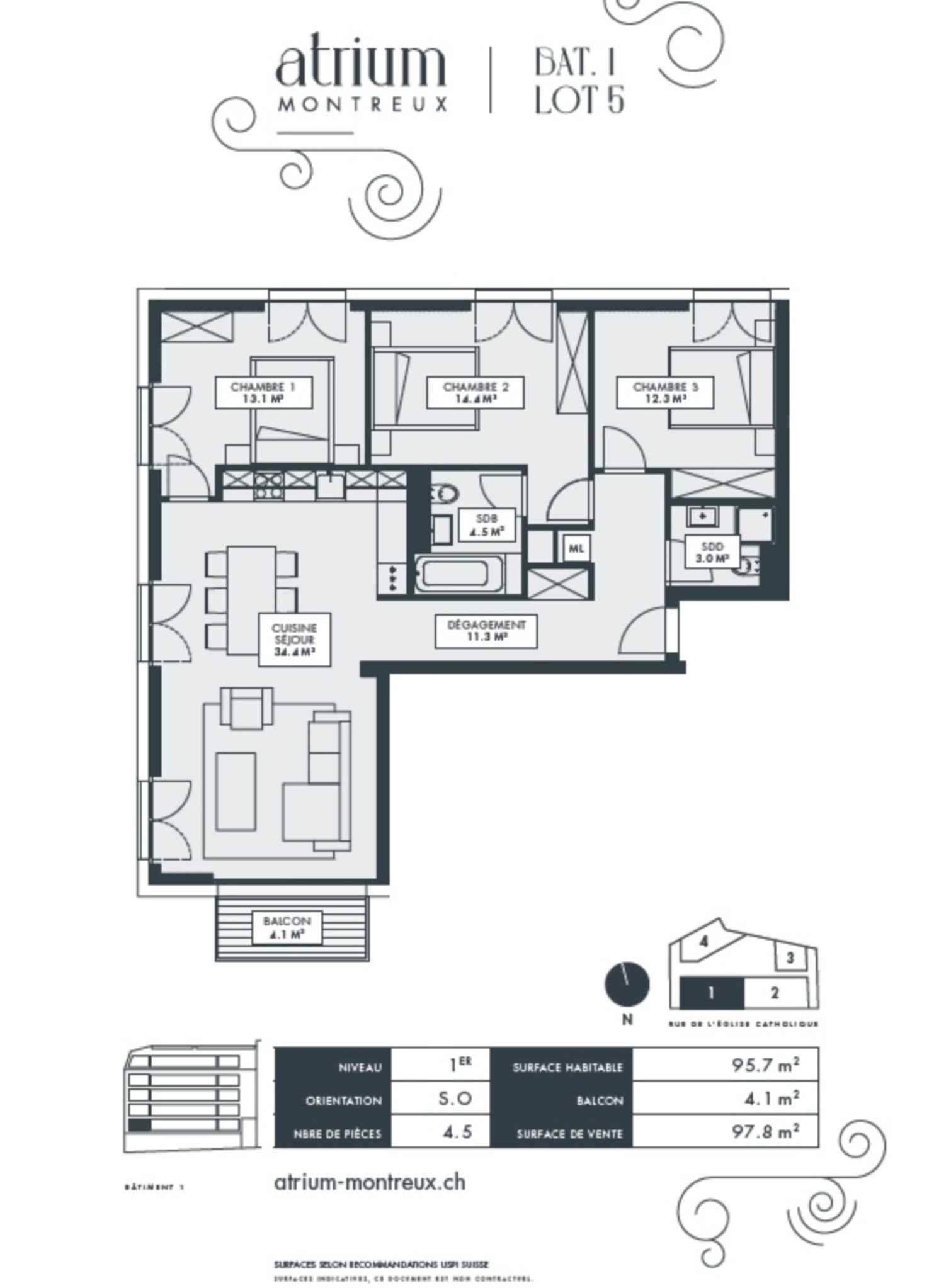 Le Lot No 5 se situe au 1er étage du bâtiment 1, face à la Rue de l'Eglise-Catholique. Il regroupe 95.7 m2 hab. plus un balcon 4 m2. Il est orienté Sud/ouest. Sa distribution est très spacieuse et aérée. Il bénéficie d'un grand séjour/salle à manger de 34.4 m2, de 3 chambres à coucher respectivement de 12.3 m2, 13.1 m2 et de 14.4 m2 avec deux salles d'eau (une salle de bain et une salle de douche). Finitions à choix selon descriptif de construction de l'architecte.