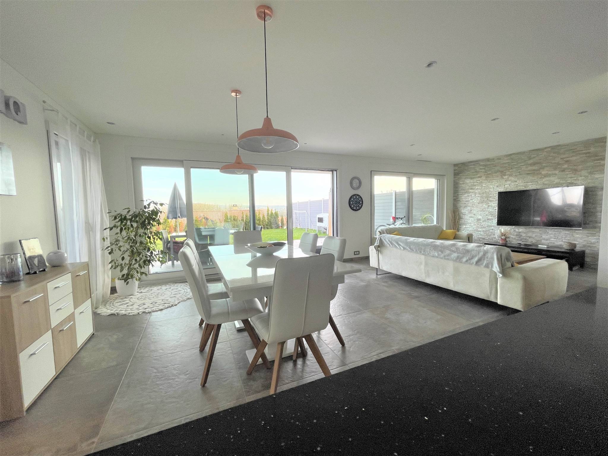 Au rez-de-chaussée : Un hall principal de plus de 13m2 avec armoires murales, une cuisine parfaitement équipée et ouverte sur le spacieux séjour/salle à manger avec un accès direct à la terrasse et au jardin par de grandes baies vitrées. WC visiteurs.