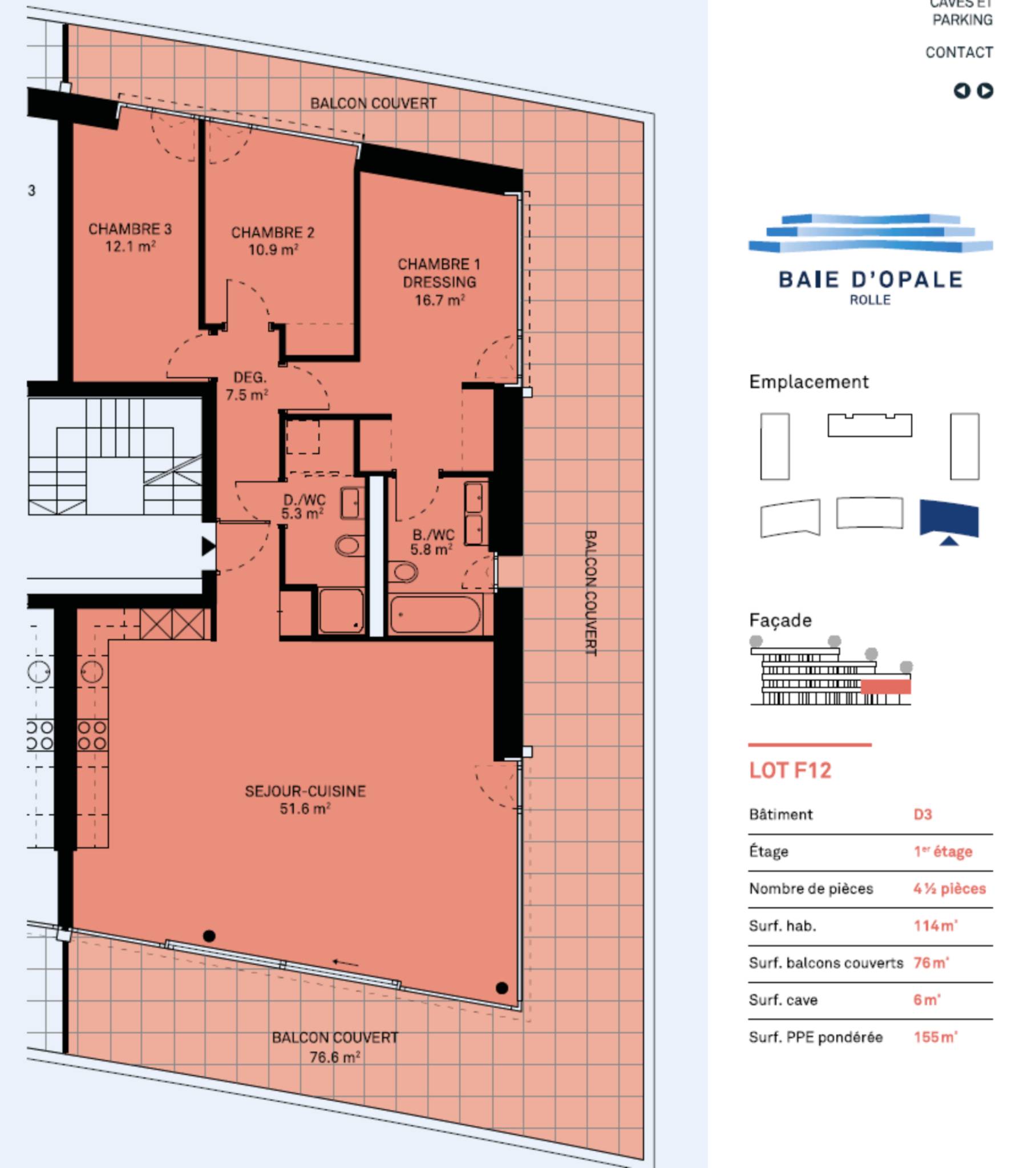 À découvrir : spacieux 4.5 pièces de 114 m² en angle, traversant, avec un magnifique balcon de 76 m² qui entoure tout l’appartement – exposition sud côté séjour, nord côté nuit.