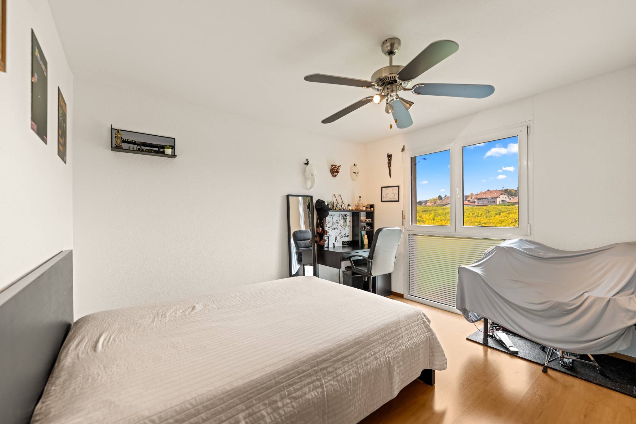 La partie nuit, bien séparée, se compose de trois chambres et de deux salles d'eau. La suite parentale bénéficie de sa propre salle de douche privative et d'un balcon sans vis-à-vis, idéal pour profiter du soleil couchant. L'appartement dispose également d'une cave et de deux places de parc intérieures (CHF 70'000.- en sus du prix).