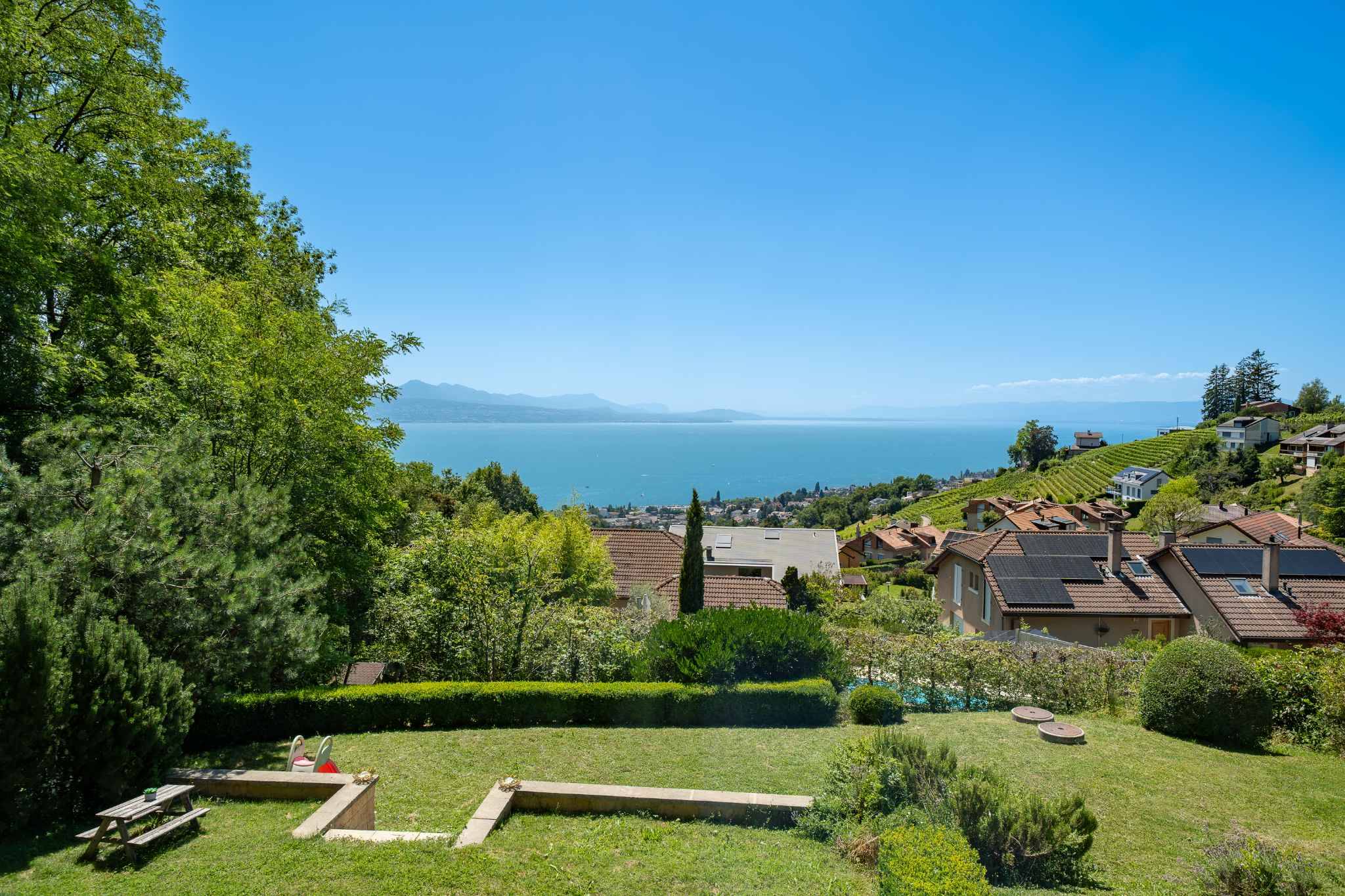 La propriété offre une magnifique vue dégagée sur le lac Léman et bénéficie d’un ensoleillement optimal.