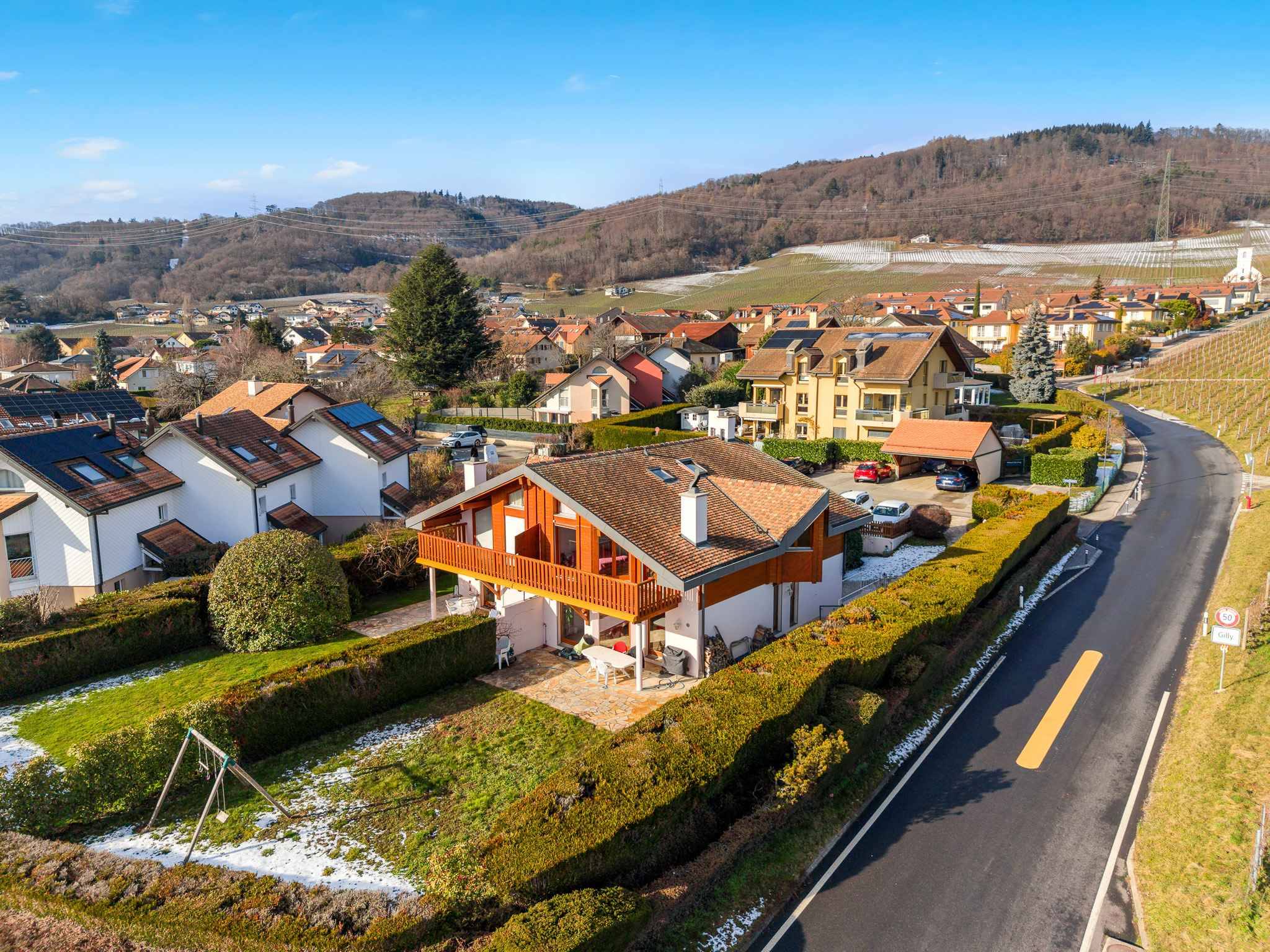 Le village de Gilly, paisible et pittoresque, se trouve à mi-chemin entre Lausanne et Genève. Il offre un cadre de vie privilégié avec ses vignobles et sa forêt idéale pour la randonnée et les activités de plein air. Le village dispose de toutes les commodités à proximité : arrêt de bus, école enfantine et primaire, terrains de sport, place de jeux, auberge communale et administration. Les sorties d’autoroute de Rolle et Gland sont accessibles en cinq minutes en voiture et le village est relié aux gares locales par le car postal.