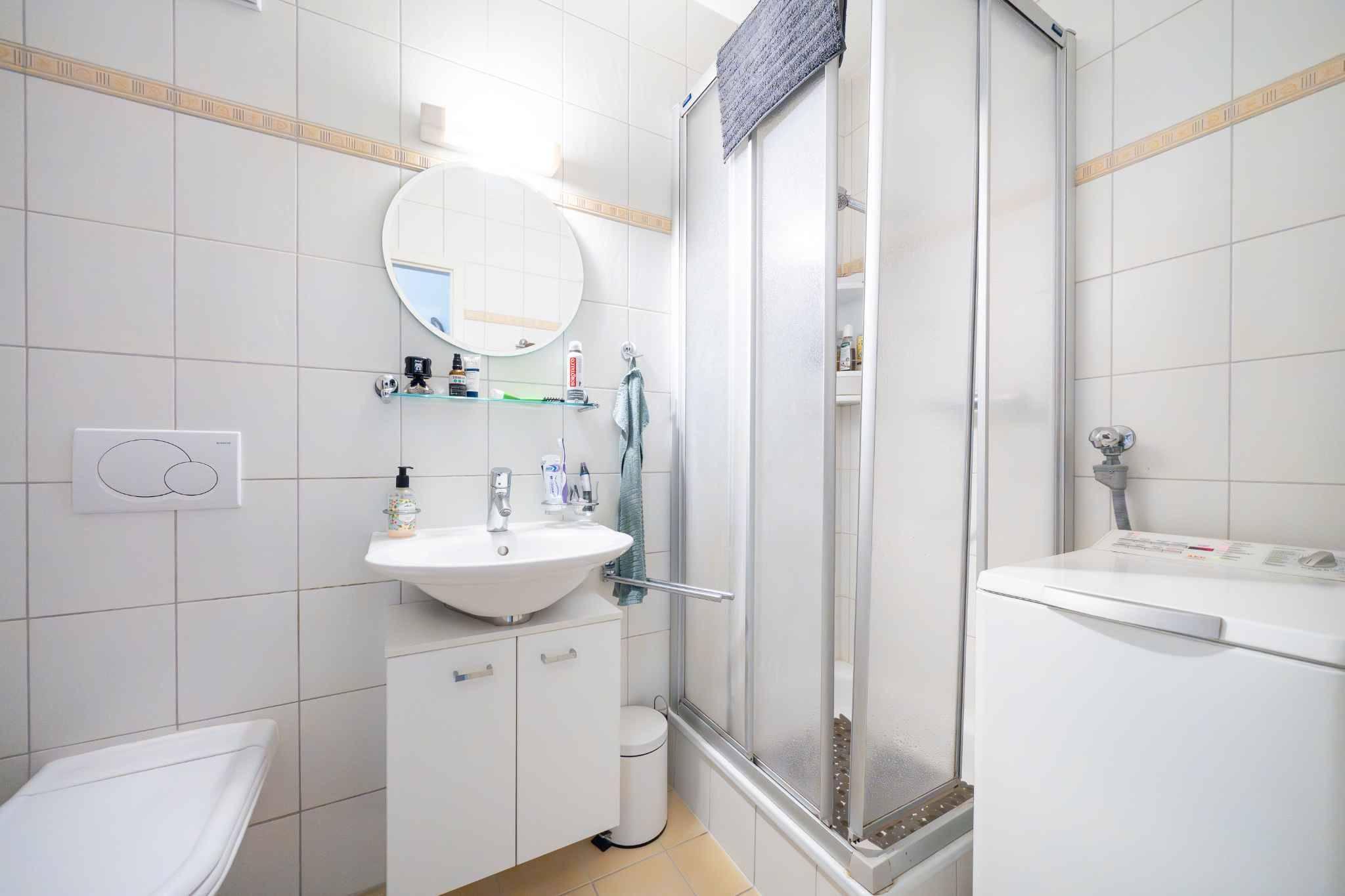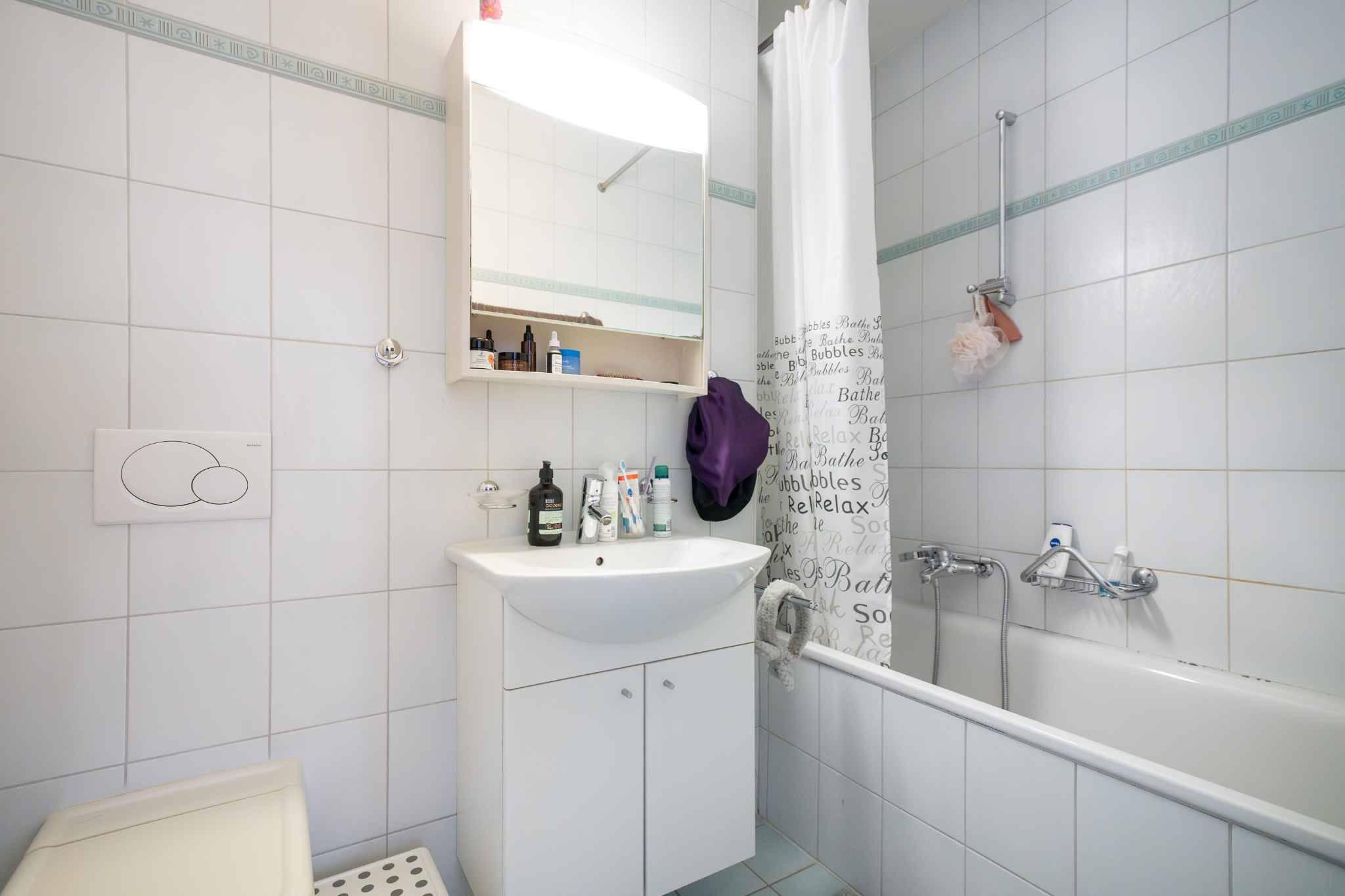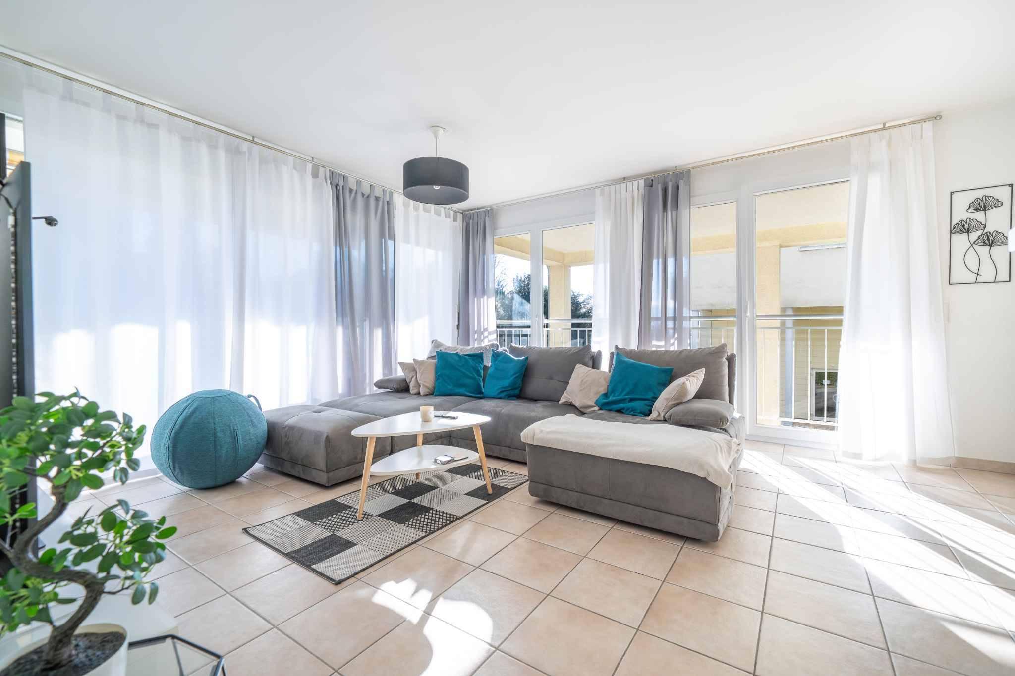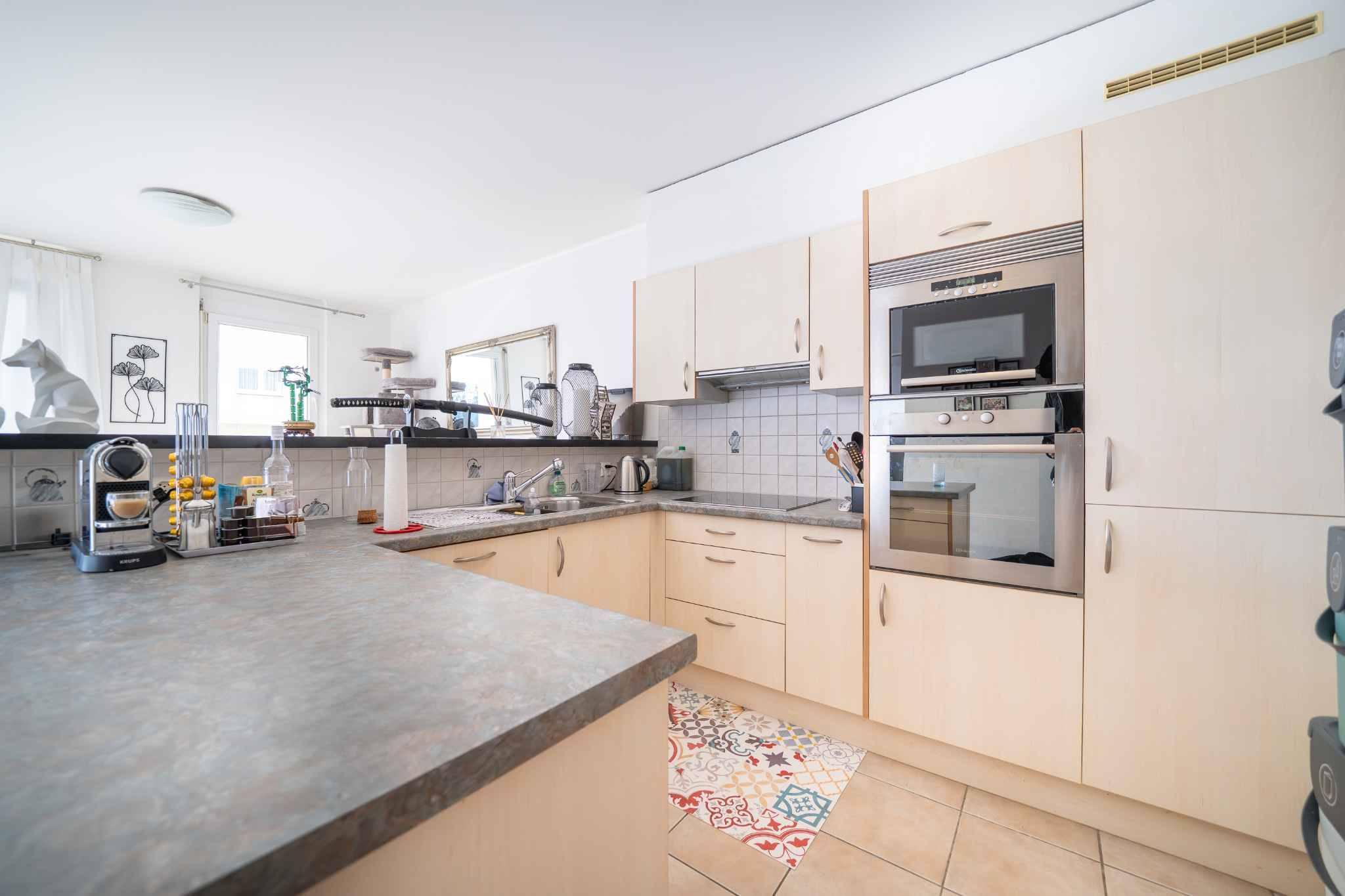 Die Küche öffnet sich zu einem hellen Wohnzimmer mit einem nach Südosten ausgerichteten Balkon, der von einem angenehmen Blick auf den See profitiert.